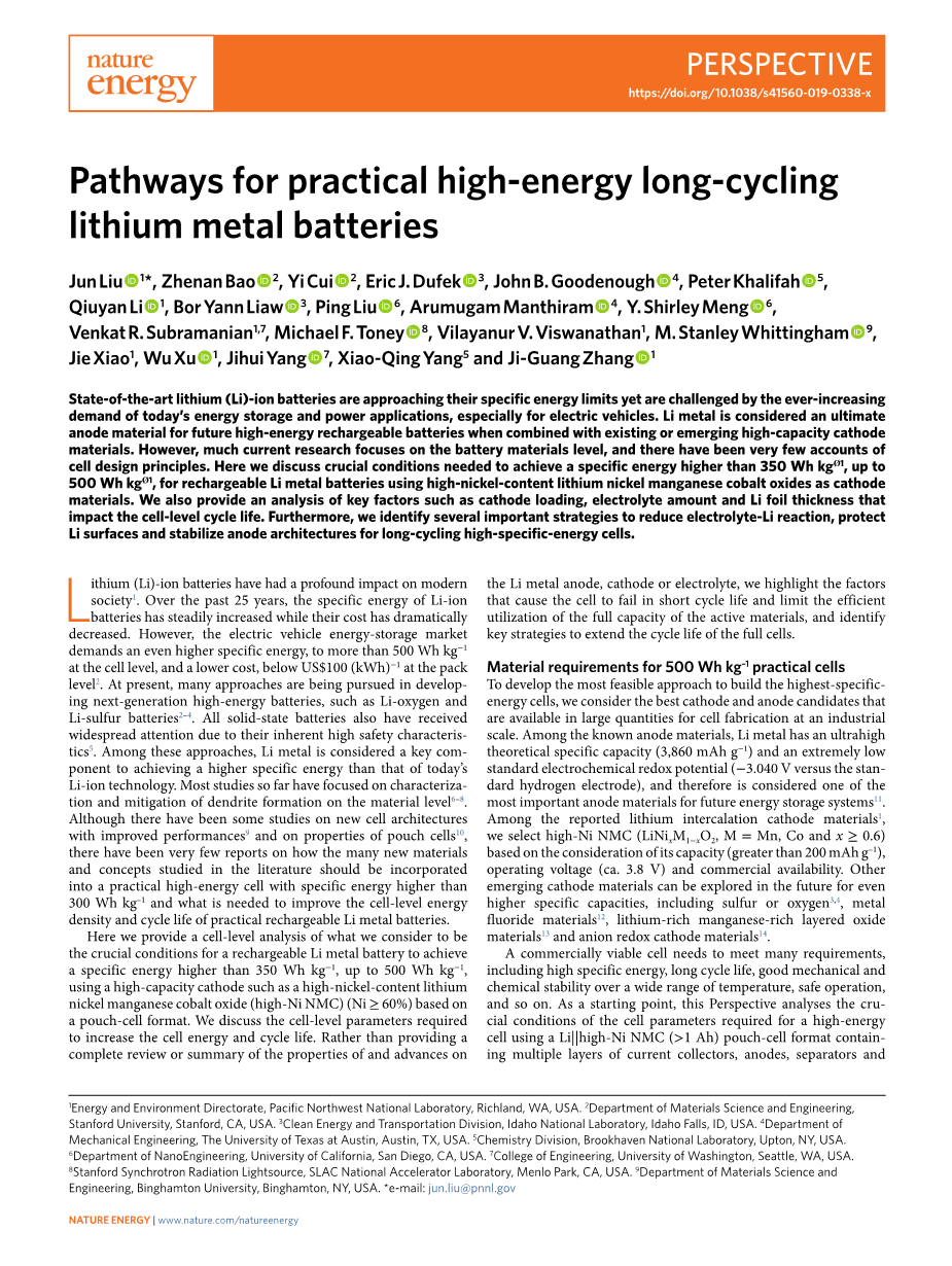 Jun Liu  1*, Zhenan Bao  2, Yi Cui  2, Eric J. Dufek  3, John B. Goodenough  4, Peter Khalifah  5,Qiuyan Li  1, Bor Yann Liaw  3, Ping Liu  6, Arumugam Manthiram  4, Y. Shirley Meng  6, Venkat R. Subramanian1,7, Michael F. Toney  8, Vilayanur V. Viswanathan1, M. Stanley Whittingham  9,Jie Xiao1, Wu Xu  1, Jihui Yang  7, Xiao-Qing Yang5 and Ji-Guang Zhang  1