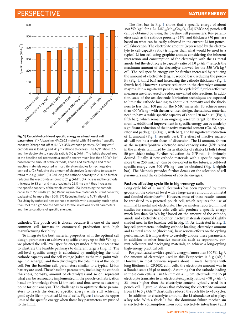 在这里我们提供了一个电池级别的分析,我们认为可充电锂金属电池达到一个高于350 Wh kgminus;1、达到500 Wh kgminus;1比能的关键条件,是使用高容量阴极,如基于软包电池形式的高镍含量的锂镍钴锰氧化物(高镍NMC)(Nige;60%)。我们讨论了提高电池能量和循环寿命所需的电池级别的参数。与其提供一个对锂金属阳极、阴极和电解质性质与进展的完整回顾或总结,我们强调了导致电池的短循环寿命和限制活性材料全部容量的充分利用的因素,并确定了延长整个电池循环寿命的关键策略。