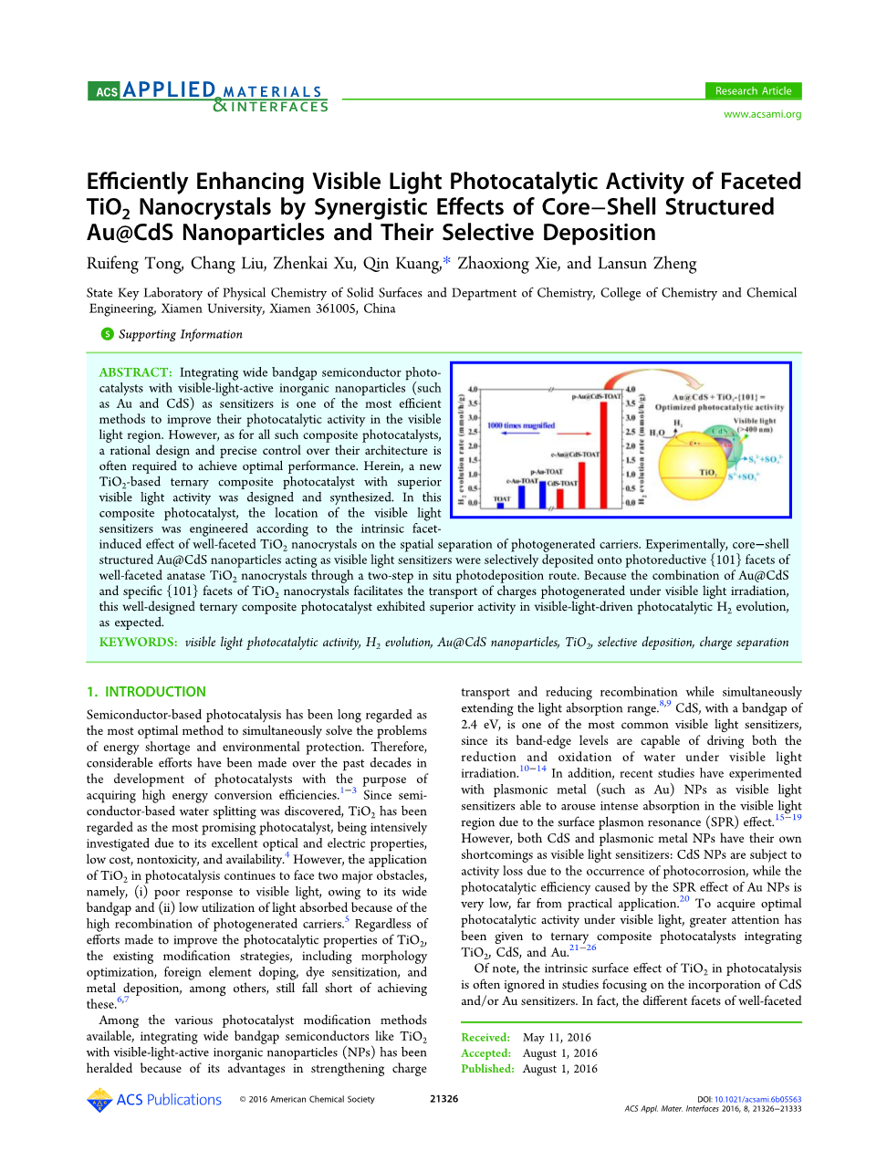 核壳结构Au@CdS纳米粒子的协同作用及其选择性沉积有效提高切面TiO2纳米晶的可见光催化活性