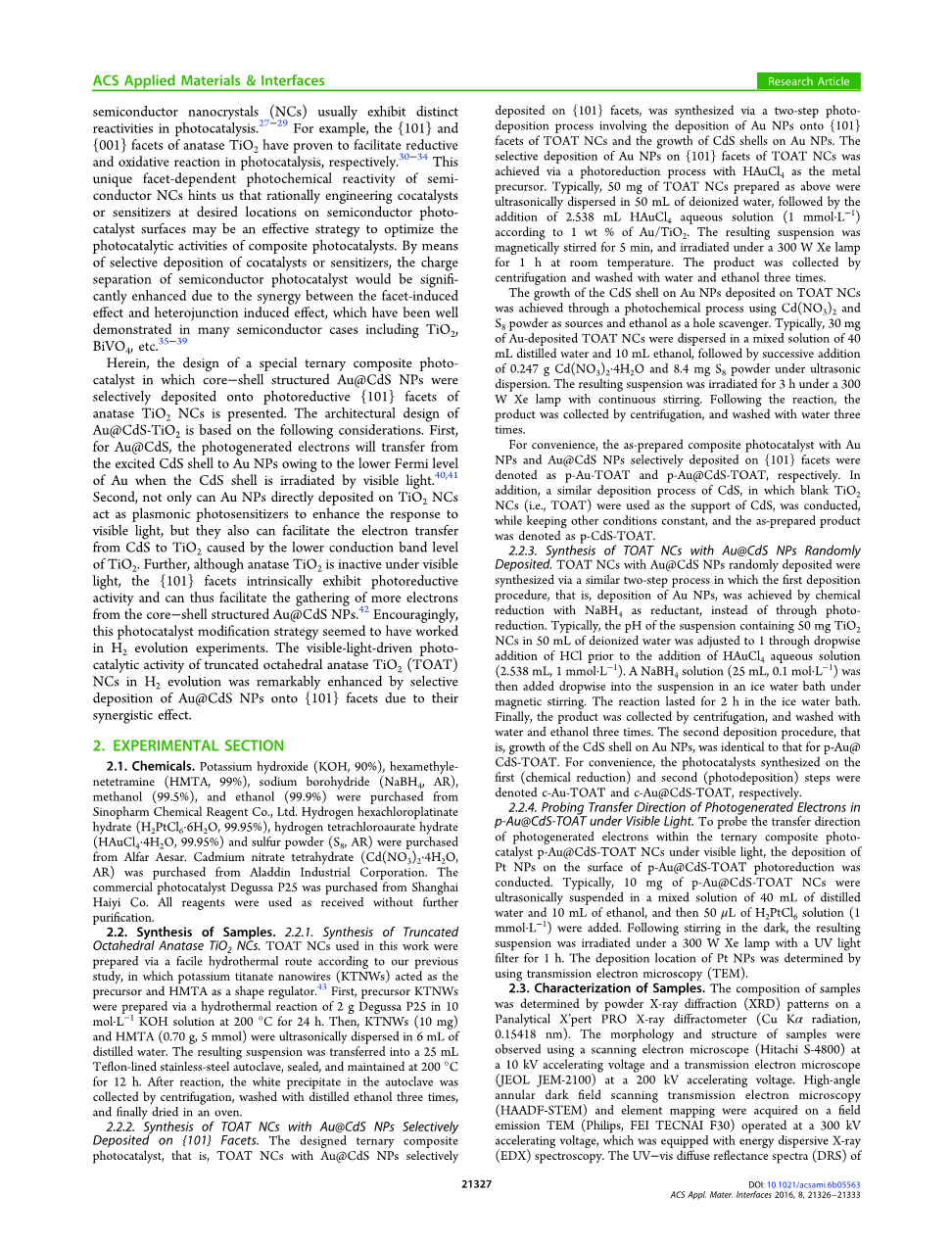 2.2.样品的合成。2.2.1.截短八面体锐钛矿TiO2 NCs的合成。在这项工作中使用的TOAT NCs是根据我们之前的研究,通过简单的水热路线制备,其中钛酸 钾纳米线(KTNW)充当前体,HMTA充当形状调节剂。43 首先,通过2g Degussa P25在10mol·Lminus;1 KOH溶液中在200℃下水热反应24小时制备前体KTNW 。然后,将KTNW(10mg)和HMTA(0.70g,5mmol)超声分散在6mL蒸馏水中。将所得悬浮液转移到25mL特氟隆衬里的不锈钢高压釜中,密封,并在200℃下保持12小时。反应后,通过离心收集高压釜中的白色沉淀, 用蒸馏乙醇洗涤三次,最后在烘箱中干燥。