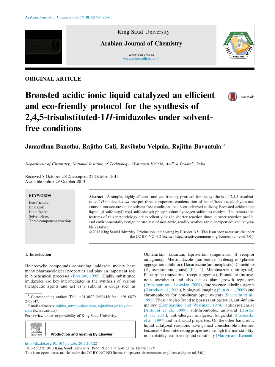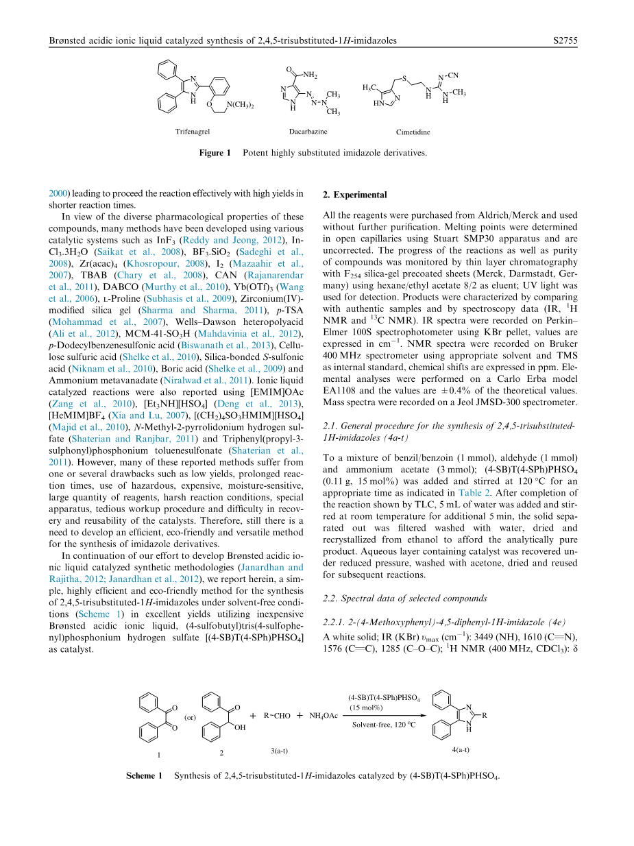 鉴于这些化合物具有多种药理特性,采用很多催化系统,如三氟化铟(Reddy和Jeong,2012年),三水三氯化铟(Saikat等人,2008),二氧化硅三氟化硼(Sadeghi等人, 2008年)、乙酸锆(Khosropour,2008年)、碘(Mazaahir等人,2007年)、Tbab(Chary等人,2008年)、Can(Rajanarendar等,2011),DABCO(Murthy等,2010),YB(OTF)3(Wang等人,2006),L-脯氨酸(Subhasis等人,2009),锆(IV)-改性硅胶(夏尔马和夏尔马,2011),P-TSA(Mohammad等人,2007),Wells–Dawson杂多酸(Ali等人,2012),MCM-41-SO3H(Mahdavinia等人,2012),p-十二烷基苯磺酸(Biswanath等人,2013),纤维素硫酸(Shelke等人,2010),硅键S-磺酸酸(Niknam等人,2010)、硼酸(Shelke等人,2009)和偏钒酸铵(Niralwad等人,2011年)。还使用了[emim]OAC进行离子液体催化反应的情况(Zang等人,2010年),【Et3NH】【HSO4】(Deng等人,2013年),[Hemim]bf4(夏路,2007),[(CH4so3hmim][hso4](Majid等人,2010年)、N-甲基-2-吡咯烷酮硫酸氢盐(Shaterian和Ranjbar,2011年)和三苯基(丙基-3-磺酰)对甲苯磺酸膦(Shaterian等人,2011年)。然而,许多所报道的方法都存在一个或多个缺点,例如产率低、反应时间长、使用危险、昂贵、对水分敏感、试剂量大、反应条件苛刻、专用仪器、冗长的修井程序以及催化剂回收和再利用困难。因此,开发一种高效、环保、通用的咪唑类化合物的合成方法仍然是十分必要的。