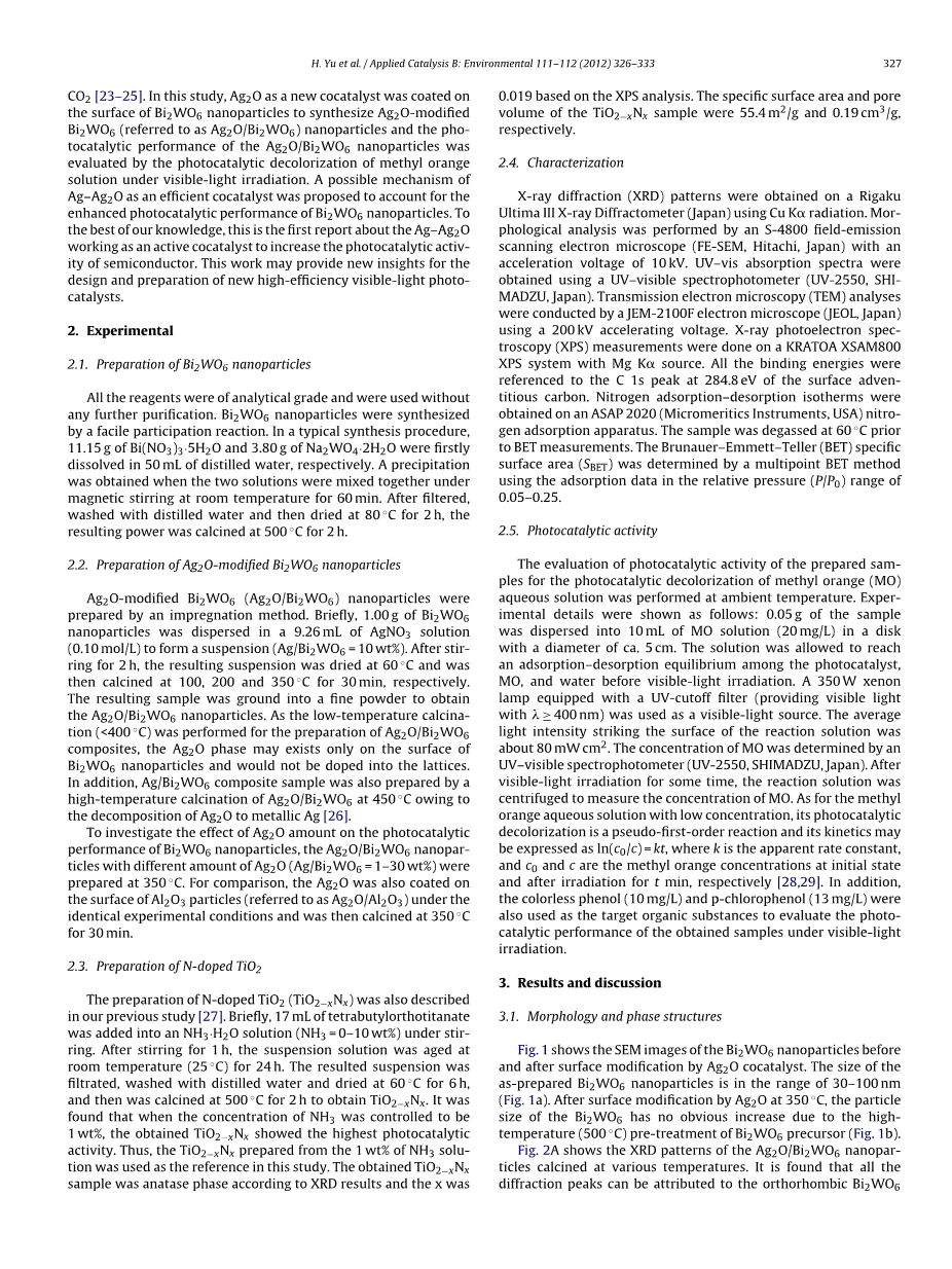 Ag2O 修饰的Bi2WO6(Ag2O/Bi2WO6)纳米颗粒通过浸渍法合成。首先,将 1.00 g Bi2WO6 纳米颗粒分散于 9.26 ml 的 AgNO3 溶液(0.10 mol/L)中,形成悬浊液(Ag/Bi2WO6 = 10 wt%)。经搅拌 2 小时后,将所得的悬浊液于 60 oC 烘干,然后再分别于 100、200 和300 oC下煅烧 30 分钟。将所得的样品研磨成细粉,就得到了 Ag2O/Bi2WO6 纳米颗粒。在制备 Ag2O/Bi2WO6 纳米颗粒的过程中,当低温(lt; 400 oC)热处理时,Ag2O 相将可能仅仅存在于 Bi2WO6 纳米颗粒的表面,而不掺杂进入其晶格中。此外,Ag/Bi2WO6 样品在 450 oC 高温煅烧 Ag2O/Bi2WO6 复合物的过程中得到,这是由于在高温下 Ag2O 分解生成金属单质 Ag。