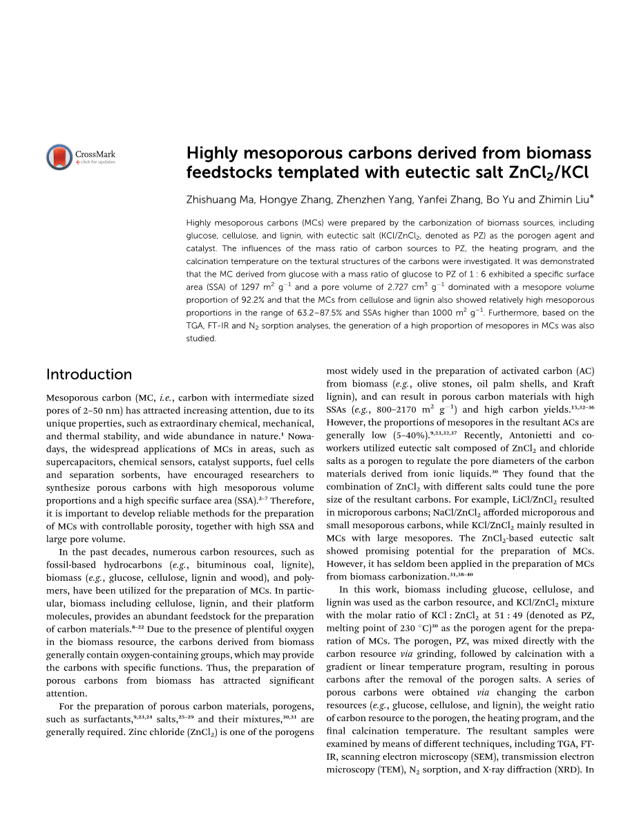 对于多孔碳材料的制备,多孔剂,比如表面活性剂盐及他们的混合物通常都是需要的,在生物质中提取活性碳中氯化锌是其中一个使用最广泛的多孔剂材料,而且氯化锌能使多孔碳有高的比表面积(800-2170 m2 g-1)和高的产量。然而,中孔的比例在合成的活性碳中通常是很低的(5-40%)最近,Antonietti和他的伙伴们利用由氯化锌和氯化盐组成的共融盐作为调节提取自离子液体的碳材料气孔直径的造孔剂。他们发现氯化锌和不同盐的混合可以调整合成碳的孔隙大小,例如,氯化锌和氯化锂的组合可以合成多微孔碳,氯化锌和氯化钠的组合可以合成微孔和小介孔碳,然而氯化锌和氯化钾的组合主要导致MCs大间隙孔。ZnCl2-based共晶盐显示制备MCs的潜力。然而,它很少被应用于制备生物质 碳化物的MCs。