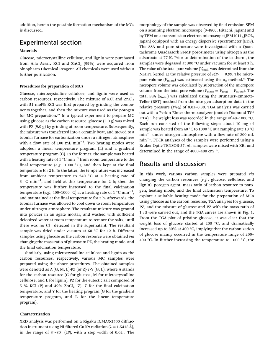 葡萄糖、微晶纤维素和木质素分别被用作碳资源。51 mol% 氯化钾和49mol%通过研磨混合在一起,作为制备MCs的遭孔剂。在一个典型的使用葡萄糖作为碳资源制备MCs的实验中,取葡萄糖(3.0 g)和PZ(9.0 g)在室温下研磨。随后,混合物转移到瓷舟,将瓷舟转移到一个管式炉,在通氮气下碳化,氮气流速是100毫升每分钟。采用两种加热方式::线性煅烧温度程序(L)和一个梯度温度程序(G),前者表示,样品以每分钟升高1摄氏度的速率从室温加热到最后温度(如。1000 C),然后维持在最后温度2 h。后者表示,温度从环境温度提高到240摄氏度,升温速率3 摄氏度每分钟,然后保持这个温度2 h;接着温度进一步上升到煅烧温度(如,400 - 1000 摄氏度),升温速率为1摄氏度每分钟,温度维持在最后温度2 h。后来,,管式炉在氮气氛围下冷却到室温。合成的混合物在一个玛瑙研钵中研磨成粉末,在室温下用足够的去离子水清洗去除盐,直到上层清液中没有检测到氯离子。合成样品在60摄氏度下真空干燥12 h。不同样本使用葡萄糖作为碳资源是通过改变葡萄糖与PZ的质量比、加热模式,和最后的煅烧温度。