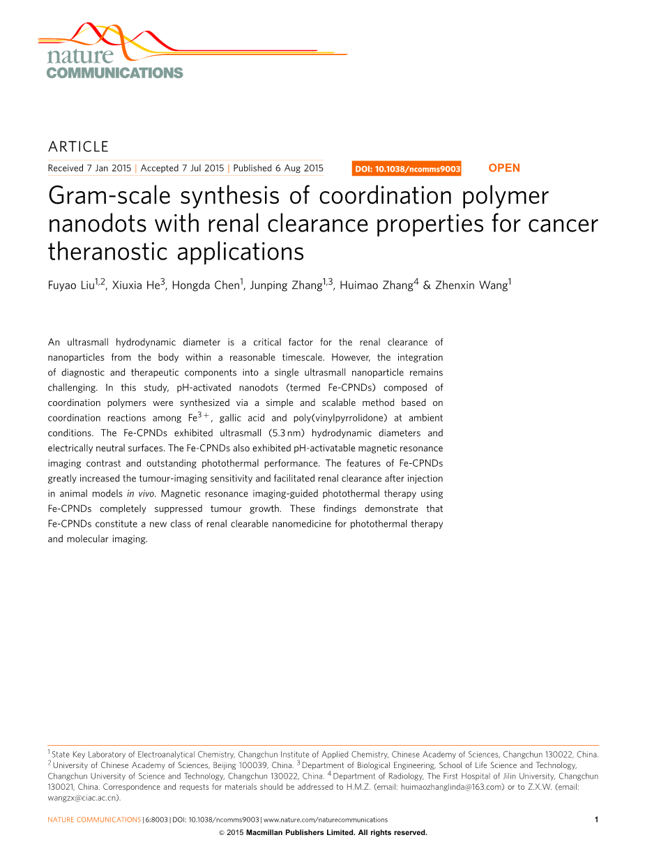 治疗学纳米药物领域的近期发展通过提供个性化药物提高了我们提供高质量生活和患者存活率的能力[1-5]。因为它们可协调的物理化学特性,许多无机、有机的纳米颗粒,包括碳纳米管,金属纳米颗粒和脂质体都能被合成应用于疾病的检测和药物的传输[6-9]。特别的,基于高分子配合的纳米颗粒(也被称作纳米尺寸的金属有机配合物或者纳米级的金属有机框架)被认定在纳米药物方面有可观的前景。因为无机有机的纳米颗粒都展现出吸引人的优势。例如相对规律的形状,硬质,多样性的组成,生物降解性和表面易于功能化[10-12]。举个例子,Lin等人报导他们自己合成的纳米级锌二磷酸盐高分子配合物平台,被设计用作在肿瘤细胞中有选择性的吸附铂和奥沙利铂[10]。