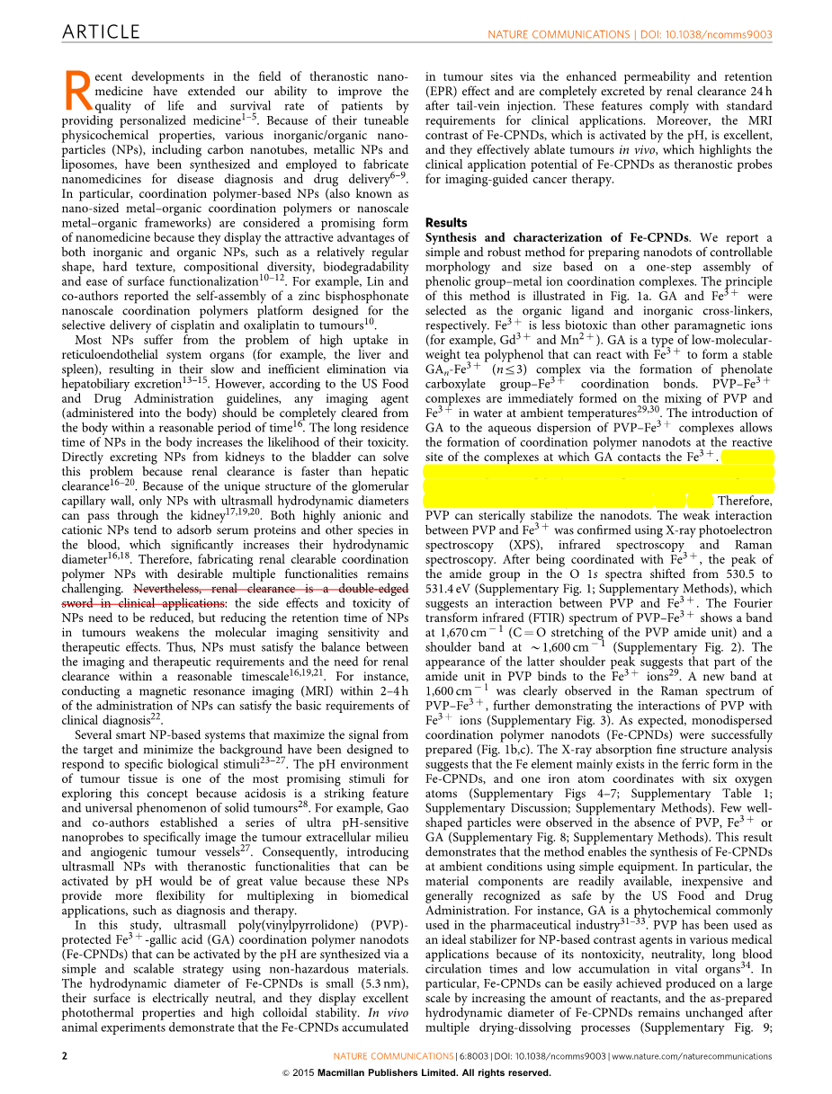 在本研究中,超小尺寸的PVP-Fe3 -GA高分子配合物纳米点(Fe-CPNDs)可以通过一个简单可行的方式用无害的材料合成。Fe-CPNDs的直径小至5.3nm,表面呈电中性,并且展示出杰出的光热响应性能和高稳定的胶体性质。在动物体内实验中证明Fe-CPNDs通过增强渗透作用在癌细胞位点积累、保留。并且在尾静脉注射24小时后能完全被肾脏清理。这些特性都能复合临床需求。并且,被pH活化的Fe-CPNDs的核磁共振成像对比图表现出非常好的性质。Fe-CPNDs有效的消除了体内的肿瘤细胞,以Fe-CPNDs在癌症治疗上作为肿瘤细胞成像探针具有临床应用的前景。
