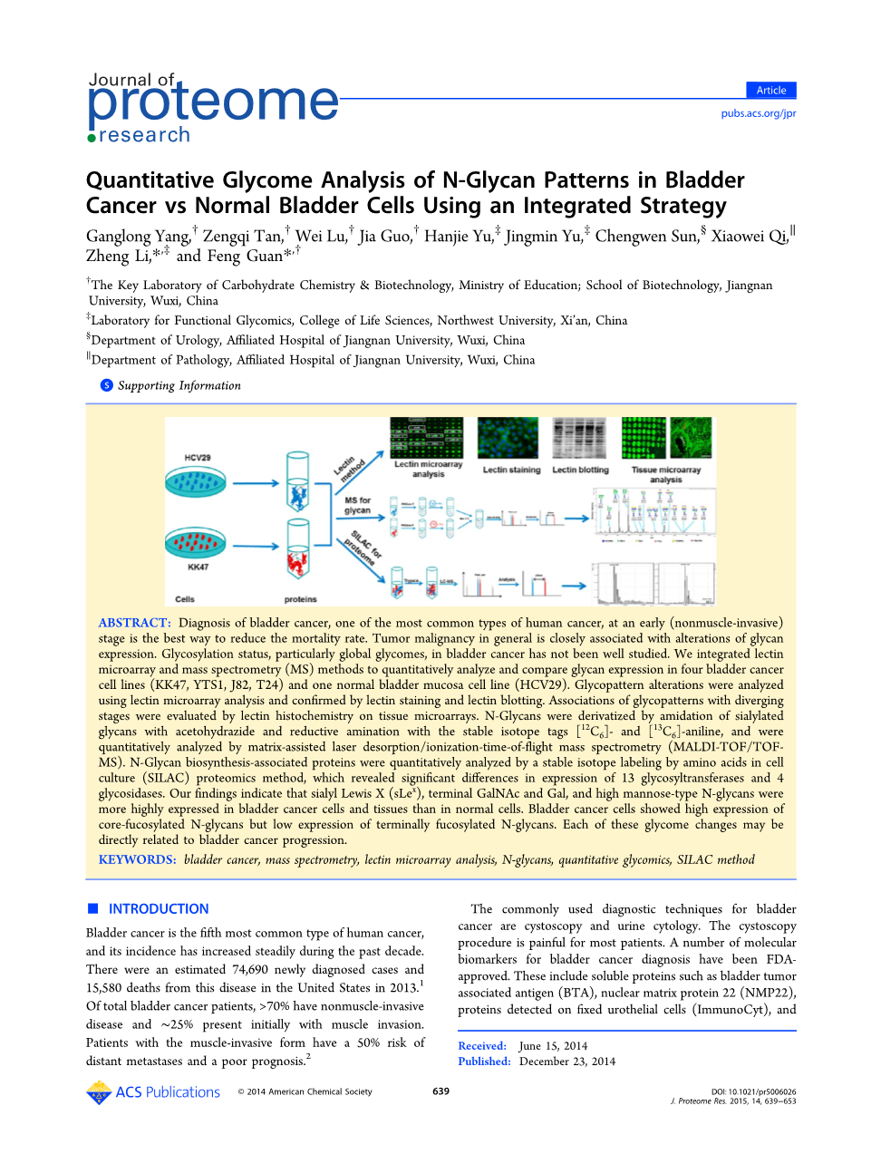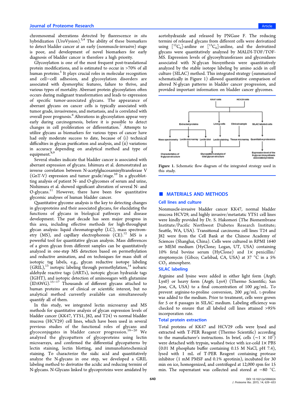 在本研究中,我们整合了凝集素微阵列和质谱的方法用于定量分析膀胱癌细胞系(KK47,YTS1,J82和T24)与正常膀胱粘膜细胞系(HCV29)的糖基表达水平,这些细胞系先前已经用于多种对聚糖和糖缀合物在膀胱癌进展中的功能作用的研究中[18-20]。我们用凝集素微阵列的方法分析糖蛋白的糖型,并通过凝集素染色、凝集素印迹以及免疫组织化学染色的方法对不同的糖型进行证实。为了在一个步骤中表征唾液酸并定量分析N-聚糖,我们开发了GRIL标记方法以衍生酸化过的和终端还原过的N-聚糖。与糖蛋白连接的N-聚糖被乙酰肼胺化并被PNGase F释放。我们将释放于不同细胞的聚糖的还原末端分别用[12C6]-苯胺和[13C6]-苯胺进行衍生化,并通过MALDI-TOF/TOF-MS定量分析衍生化的聚糖。通过同位素标记方法中的氨基酸的稳定同位素标记来定量分析与N-聚糖生物合成相关的糖基转移酶和糖苷酶的表达水平。这种整合策略(如图1概述)允许对膀胱癌进展中改变的N-聚糖模式进行定量比较,并提供关于膀胱癌糖尿病的重要信息。