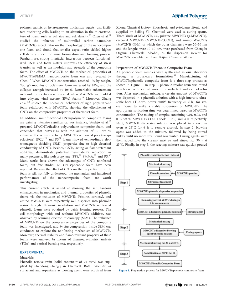 Chen等人21研究了多壁碳纳米管(MWCNTs)的长宽比对纳米复合泡沫形态的影响,并发现在相同配方和发泡过程条件下,小的长宽比可以产生大的泡体密度。此外,功能化碳纳米管和泡沫基质之间的强相互作用,提高了泡沫的压力转化效率以及复合材料的模量和泡沫强度。陈还揭示了多壁碳纳米管对MWCNTs/ PMMA纳米复合材料泡沫的力学性能的影响。22当多壁碳纳米管的重量浓度达到1%时, 杨氏模量的聚合物泡沫增加了82%,破裂强度增加了104%。当把多壁碳纳米管加入到乙烯醋酸乙烯酯(EVA)泡沫中时发现其拉伸性能显著增强。23 而且,张等24研究了用MWCNTs增强的硬质聚氨酯泡沫的力学性能,揭示了碳纳米管在增强热固性泡沫的抗压性能方面的效果。此外,多功能碳纳米管/聚合物复合泡沫显示了越来越重要的意义。例如,Verdejo等25制备了多碳纳米管/灵活的聚氨酯复合泡沫,得出的结论是,当多壁碳纳米管的重量比达到0.1%,会提高泡沫的声音活动。多壁碳纳米管增强聚(e-caprolactone)(PCL)26和PS27泡沫由于碳纳米管的高导电性能,表现出了非凡的电磁屏蔽(EMI)效应。此外,碳纳米管,作为阻燃添加剂,证明其可以降低许多聚合物,如聚丙烯(PP),28 PMMA、29和PS30 等的可燃性。很多研究已经显示了碳纳米管增强泡沫的优点,但很少有碳纳米管/酚醛泡沫的研究报道。因为碳纳米管在对脆性泡沫的性能影响仍不完全清楚。因此,纳米复合材料泡沫的机械和功能性都很值得研究。