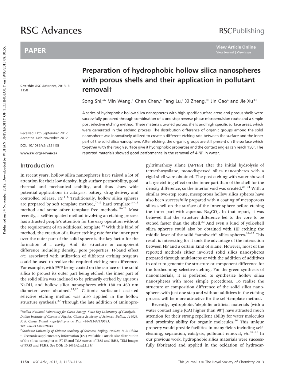空心二氧化硅微球(HSSs)在很多方面有很广泛的应用,比如说催化,传感,药物载体和纳米反应器。一个简单的HSSs制备方法是模板法,包括核/壳结构的形成和核的移除。很多研究都表明可以用硬/软模板法来制备HSSs。然而,很多情况下的硅氧层多相沉积由于不均相成核的二氧化硅很难控制。为了克服这个问题。一些研究者发明了均相的模板法来制备HSSs。他们用不同结构的二氧化硅材料作为牺牲模板并且通过合适的刻蚀剂来移除模板,并且最终空心/介孔结构形成了。例如说,唐和他的伙伴,巧妙地合成了一个有机-无机杂交三层二氧化硅微球,然后用HF溶液选择性的刻蚀掉了中间的一层,形成了介孔结构。为了形成介孔HSSs,陈首先放置介孔二氧化硅在固体二氧化硅上来制造一个核/壳结构。然后选择合适的碱性刻蚀剂,固体二氧化硅核在基于结构差上被选择性溶解。