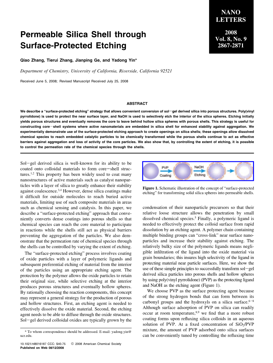 我们描述一个“表面保护刻蚀”策略,即通过容易得到的溶胶-凝胶法衍生硅转化为多空结构。聚(乙烯基吡咯烷酮)是用来保护表层附近,氢氧化钠用于选择性地刻蚀硅球内部。刻蚀最初产生多孔结构,最终消除了核心留下多空二氧化硅空心球壳。这种策略对于构建核壳系统是非常有用的,活性纳米材料嵌入到硅壳对可以增强聚合稳定性。我们实验证明使用表面保护刻蚀方法制备空心二氧化硅壳,这些空心允许溶解的化学物质达到并与嵌入的催化剂完成化学上的转化,而多孔壳继续充当有效的对核心粒子活性的聚合和损失的障碍。我们还表明,通过控制腐蚀的程度去控制化学物质通过壳的渗透速率是可能的。