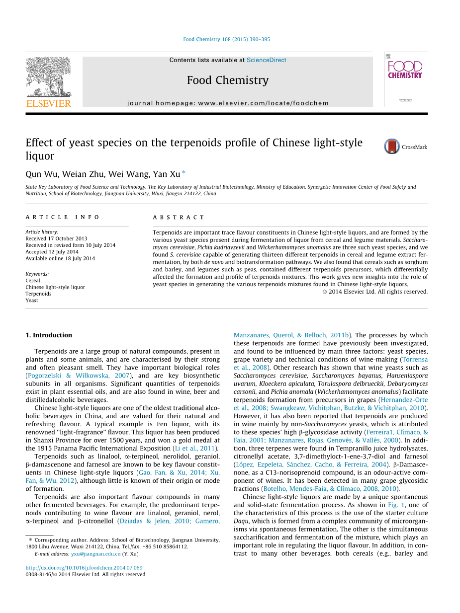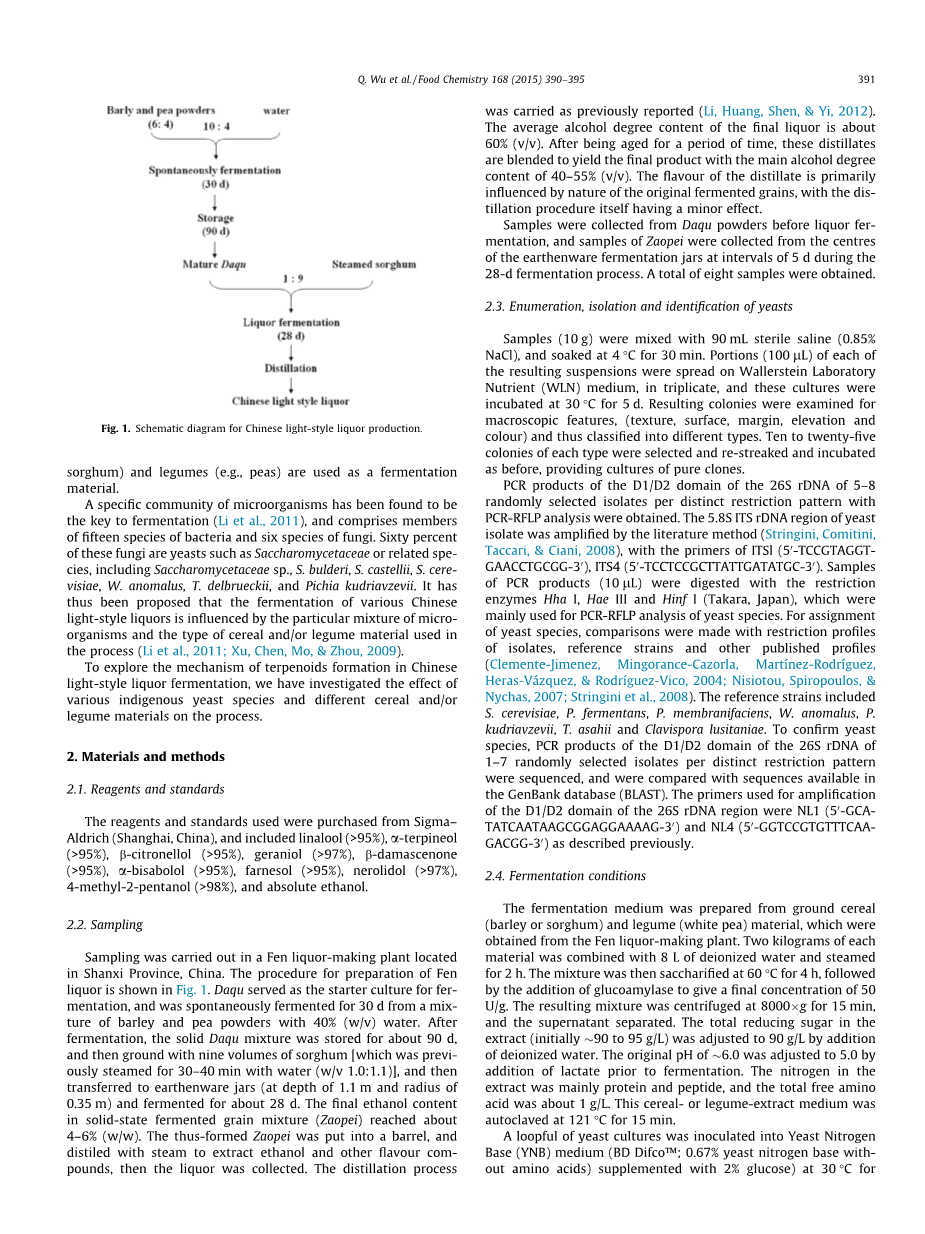 特定的微生物群落已被发现是发酵的关键(李等,2011),并包括十五种细菌和六种真菌的成员。这些真菌百分之六十酵母菌如酵母科或相关物种,包括酵母科属,Saccharomycetaceae sp., S. bulderi, S. castellii, S. cerevisiae,W. anomalus, T. delbrueckii, and Pichia kudriavzevii。因此,建议中国饮食风格白酒发酵是由微生物的特殊混合的影响和在过程中使用的谷物和/或豆科植物材料的类型。探索在中国饮食白酒类发酵的萜类化合物的形成机制,我们研究了各种本土酵母种类和不同的谷物或豆类材料对过程的影响。