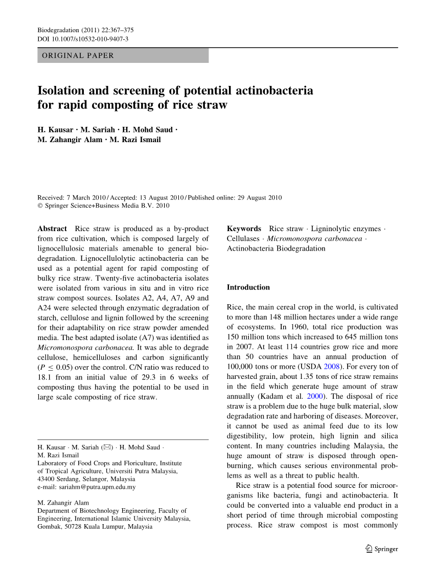 世界上主要的谷物作物米是种植的到14800万公顷以下的生态系统。1960年,稻米总产量达1.5亿吨,2007年达6.45亿吨。至少有114个国家种植水稻,超过50个国家年产10万吨以上(2008年美国农业部)。对于每吨收获的粮食,每年大约有1.35吨的稻草仍然存在,每年产生大量的秸秆(Kadam等人2000)。秸秆的处理是由于大量散装物料,降解速度慢,携带病害等问题。此外,由于其低消化率,低蛋白质,高木质素和二氧化硅含量,它不能用作动物饲料。 在包括马来西亚在内的许多国家,通过露天焚烧处理大量秸秆,造成严重的环境问题以及对公共卫生的威胁。稻草是微生物如细菌,真菌和放线菌的潜在食物来源。它可以转化成一个有价值的终端产品短时间内通过微生物堆肥过程。日本稻谷秸秆堆肥最为普遍适用于提高土壤肥力和提高产量(Hatamoto et al。2008)。为了使稻草堆肥过程在经济上可行,基于木质纤维素分解微生物的生物降解可能是现场燃烧的有效替代方法(Kumar等,2008)。堆肥可以作为有机农业营养的极好来源,以减轻肥料使用量的不利影响,放线菌由于其分解复合分子,特别是木质纤维素成分的能力而众所周知,这使得它们成为堆肥过程中的重要因素(Tang et al。2007)。它们可以在堆肥过程中在高温下生存,并从稻草中产生可溶性碳水化合物(Ball et al. 1990.)。据报道,真菌和细菌在嗜温阶段占主导地位,以利用可溶性和易于代谢的碳水化合物,而放线菌逐渐取代嗜中性种群并占主导地位