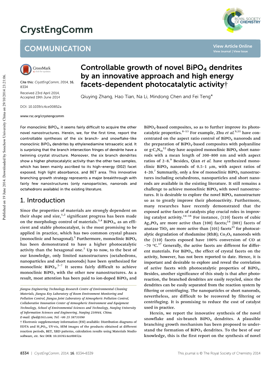 在此,我们报道了新型雪花和6枝BiPO4树突的创新合成。了解BiPO4树突的形成,提出了一种合理的分支生长机制。据我们所知,这是第一个关于合成新的树突状BiPO4的报告。此外,还利用亚甲基蓝(MB)的光降解作为探针反应,研究其光催化活性,揭示了高能级与光催化活性的相关关系。