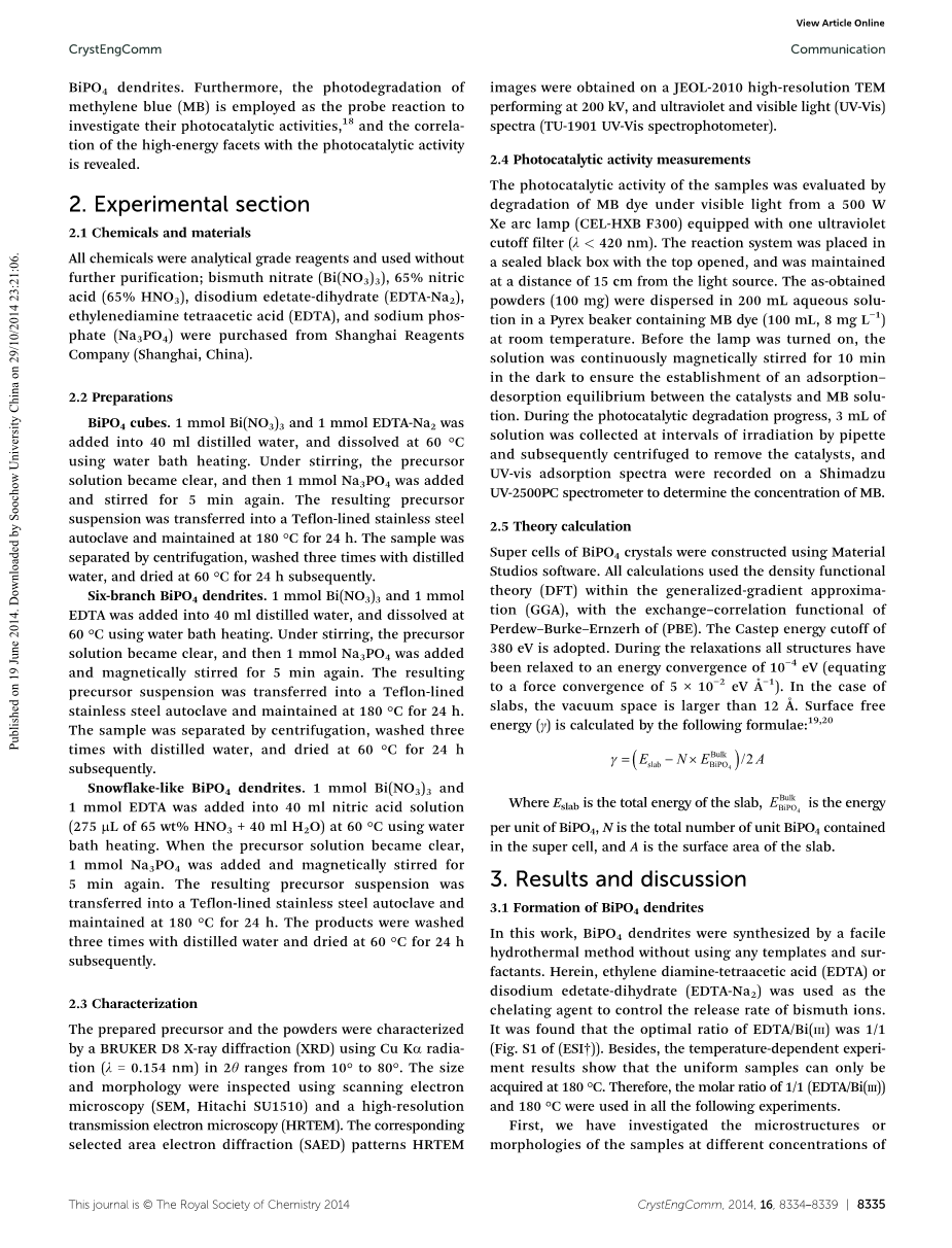 首先,我们研究了2014年6月19日发表,2014年10月29日由苏州大学下载的不同浓度的结晶器通讯样品的微观结构或形貌。在低浓度的氢离子(0.05 mol L 1, pH = 1.3), BiPO4立方体形成,有平均尺寸(4-7)(4-7)5 m(图1a)。在高浓度(0.1 mol L 1, pH = 1.0)中,达到了前所未有的6枝枝晶,其分支约为40 2 m(图1b)。有趣的是,树枝间的交角是60度(图1b的插图)。进一步将氢离子浓度增加到0.20 mol L 1 (pH =0.699),加入HNO3,这是一种有趣的像雪片样的BiPO4树枝状结构,表明进一步的分支生长已经发生(图1c)。XRD模式确定了两种样品的相纯单斜二聚体的形成(图1d)。此外,(012)/(120)峰的强度比分别为0.74、1.40和1.12,分别为6枝和雪花枝晶。两个分支样品的峰值强度约为体积的1.5-1.9倍,表明(012)面优先生长。氢离子浓度过高(0和0.3 mol L 1),相纯BiPO4样品未形成,但仅获得EDTA(图S2 of ESI)。很明显,氢离子的浓度对粒子的形貌有很大的影响。我们认为氢离子(pH)的浓度改变了Bi(III)离子的释放速率,因为氢离子已经改变了水溶液中EDTA-Bi (III)复合物的络合平衡(Fig. S3)。一般来说,Bi(III)离子在化学计量比中完全可以与EDTA结合,而EDTA分子中的4个氢离子完全释放,因为Bi(EDTA) complex具有高稳定常数(Ks = 27.94)(表S1)。在实验中使用相同数量的EDTA- na2,而不是EDTA,将氢离子浓度测定为0.05 mol L 1 (pH = 1.3),得到BiPO4立方体(图1a)。当使用相同数量的EDTA时,测定氢离子浓度为0.10 mol L 1 (pH = 1.0)。在这种情况下,6支的BiPO4形式(图1b)。氢离子的浓度为0.20 mol Lminus;1(pH = 0.699)通过添加硝酸,生成雪花形BiPO4树突形态。