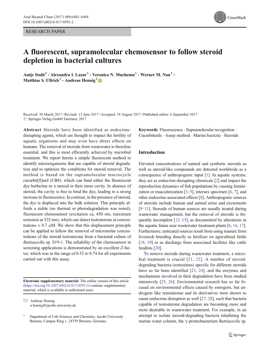类固醇已被确定为内分泌干扰剂,这被认为会影响水生生物的生育,甚至可能对人体有直接影响。因此, 去除废水中的类固醇是必不可少的, 这是最有效的微生物处理的实现。我们在此报告的简单荧光的方法来鉴定能够降解类固醇的微生物,并优化类固醇去除的条件。该方法是基于超分子葫芦[8]脲 (CB8), 它可以结合其他荧光染料黄连素或它们腔内的胆固醇。在不存在类固醇的情况下,腔体可以自由地和染料结合,导致荧光的强烈增加。相反,在激素的存在,染料转移到本体溶液。这一原理提供了一个稳定的(无热或光降解)荧光化学传感器(激发约450 nm,最大发射波长为525 nm),它可以检测睾酮浓度gt; 0.7mu;M. 我们发现,这种位移原理可以应用于类固醇睾酮的摩尔浓度的去除从细菌培Buttiauxella