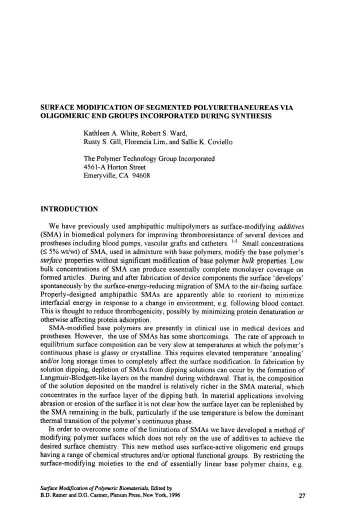 我们以前使用的两亲共聚物作为表面改性剂(表面改性剂)提高多种设备和假体包括血泵、血管和导管在生物医用高分子材料的抗血栓性能。低浓度(质量分数小于等于5%)的表面改性剂,用于混合与碱聚合物,修改基本聚合物的表面性质,而无需显着修改的基本聚合物的整体性能。表面改性剂的低体积浓度可以在形成的物品上产生完全单层覆盖。在器件元件制造过程中和之后,由表面活性剂表面能减小趋势引起,表面自发向空气表面扩散。合理设计的两亲性表面改性剂显然能够调整来减少响应环境变化的界面能,例如血液接触。这是减少血栓形成,可能是通过减少蛋白质变性或影响蛋白质的吸附