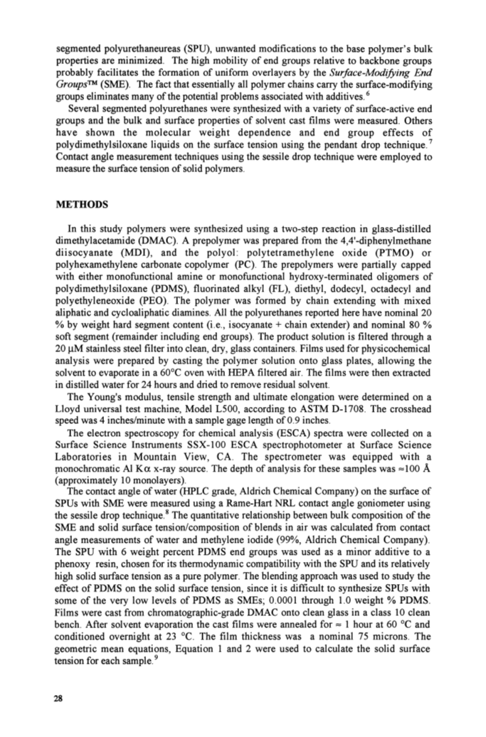 对水的接触角(HPLC级,奥德里奇化工公司)在分段聚氨酯脲与表面改性端的表面机使用帧哈特NRL接触角仪采用静滴法测量。从水和亚甲基碘化物(99%,奥德里奇化学公司)的接触角测量计算了表面改性端基的体积组成与空气中的固体表面张力/混合物的定量关系。质量分数为6%的PDMS端基被当做少量的添加剂添加到苯氧基树脂,由于它和分段聚氨酯脲的热力学兼容性以及它相对高的固体表面张力被选择作为一种纯的聚合物。混合方法被用来研究的PDMS在固体表面张力的作用,因为用一些低水平的PDMS作为SMEs合成SPUs很难;质量分数为百分之0.0001至百分之1的PDMS。投色谱级的DMAC在10级洁净工作台洁净的玻璃上制得薄膜。在溶剂蒸发后,铸膜在60℃时退火1小时并且在23℃条件下过夜,薄膜厚度为75微米。用几何平均方程、方程1和2分别计算了样品的表面张力。