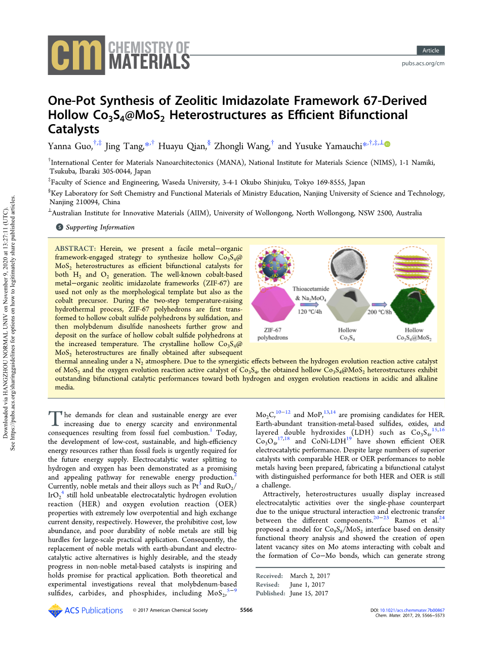 摘要:在此,我们提出了一种简单的金属-有机框架结合策略来合成中空Co3S4@MoS2异质结构,作为生成氢气和氧气的有效双功能催化剂。众所周知的钴基金属-有机咪唑酯沸石框架(ZIF-67)不仅用作形态模板,还用作钴前驱体。在两步升温水热过程中,ZIF-67多面体首先经硫化转化为空心硫化钴多面体,然后二硫化钼纳米片进一步生长,在升温过程中的空心硫化钴多面体表面沉积。在氮气气氛下进行热处理后,最终得到晶体中空Co3S4@MoS2异质结构。由于在二硫化钼析氢反应活性催化剂之间的协同作用和四硫化三钼的析氧活性催化剂的作用下得到的中空Co3S4@MoS2异质结构在酸性和碱性条件下均有优异的析氢、析氧双功能催化性能。