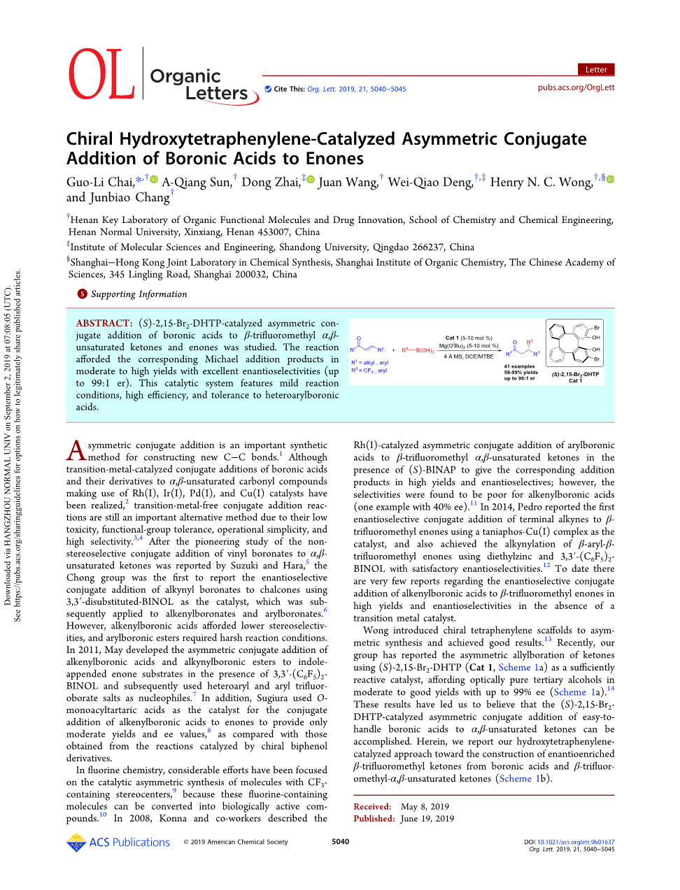 将手性四苯烯支架引入到不对称合成中,取得了良好的效果13。最近,我们小组报告了使用(S)-2,15-Br2-DHTP(Cat 1,方案路线图1a)作为一种足够的反应催化剂,提供中等至良好的产率,高达99%的ee(路线图1a)14。这些结果使我们相信,添加容易处理的(S)-2,15-Br2-DHTP催化硼酸和alpha;beta;不饱和酮的不对称共轭可以完成。在这里,我们的羟基四苯醚催化方法是从硼酸和beta;-三氟甲基alpha;beta;-不饱和酮中构建对映体富集的beta;-三氟甲基酮(路线图1b)。