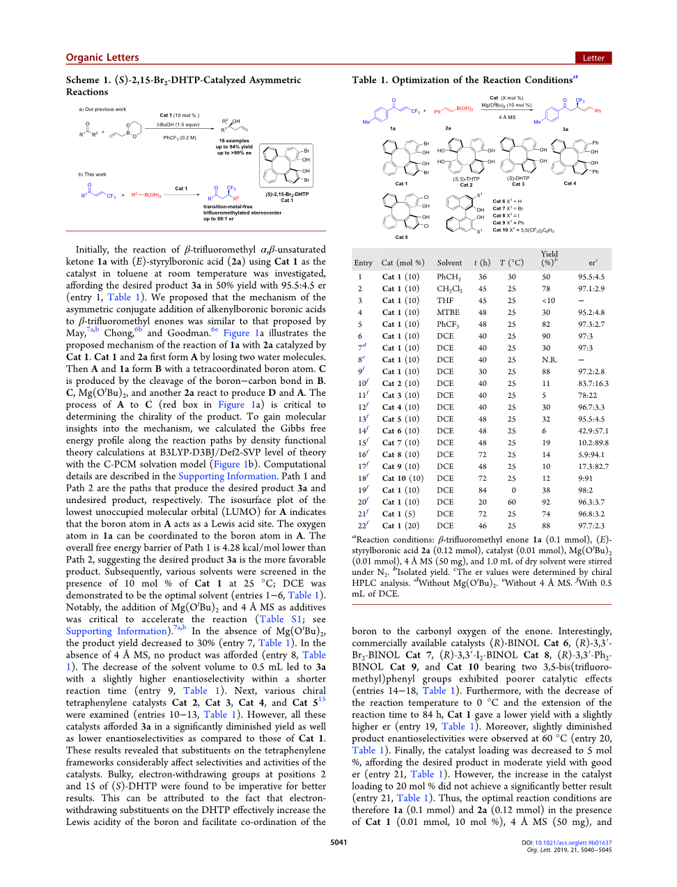 a反应条件:beta;-三氟甲基烯酮1a(0.1 mmol)、(E)-苯基硼酸2a(0.12 mmol)、催化剂(0.01 mmol)、Mg(OtBu)2(0.01 mmol)、4Aring; MS(50 mg)和1.0 mL干燥溶剂在N2下搅拌。b单独产量。c手性HPLC分析测定er值。d不含Mg(OtBu)2e不含0.5毫升的DCE。