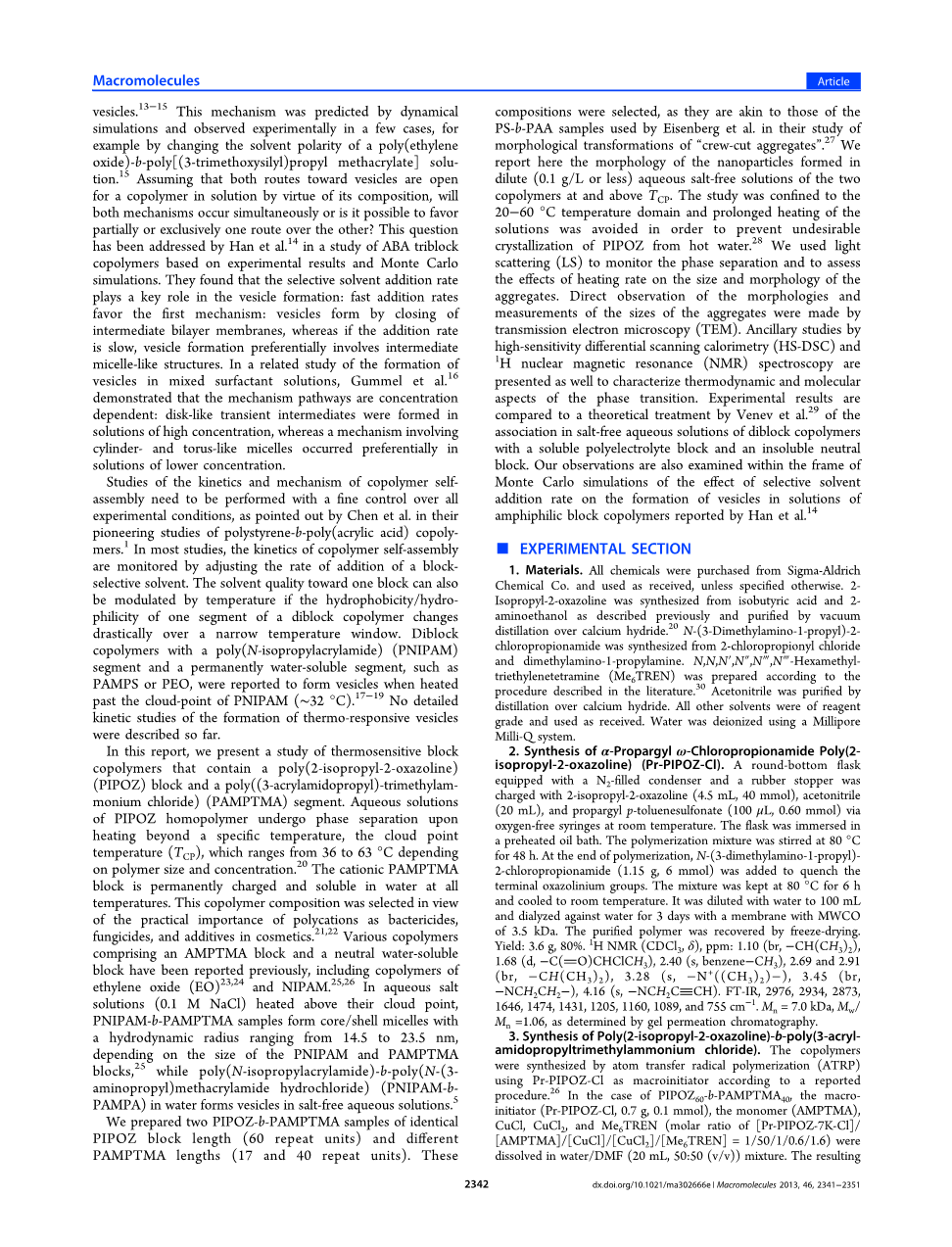 在本报告中,我们介绍了一种含有聚(2-异丙基-2-恶唑啉)(PIPOZ)嵌段和聚((3-丙烯酰胺丙基)-三甲基氯化铵)(PAMPTMA)链段的热敏嵌段共聚物的研究。PIPOZ均聚物水溶液在加热超过特定温度,即浊点温度(TCP)时发生相分离,其范围为36至63°C,这取决于聚合物的大小和浓度[20]。阳离子PAMPTMA块在所有温度下永久带电且可溶于水。鉴于聚阳离子在化妆品中作为杀菌剂,杀真菌剂和添加剂的实际重要性来选择该共聚物组合物[21,22]。之前报道了包括AMPTMA块和中性水溶性块的各种共聚物,包括环氧乙烷(EO)[23,24]和NIPAM[25,26]的共聚物。当溶液(0.1M NaCl)加热到其浊点以上,PNIPAM-b-PAMPTMA样品形成核/壳胶束,其流体动力学半径范围为14.5-23.5nm,这取决于PNIPAM和PAMPTMA块的大小[25],而聚(N-异丙基丙烯酰胺)-b-聚(N-(3-氨丙基)甲基丙烯酰胺盐酸盐)(PNIPAM-b-PAMPA)在无盐水溶液中形成囊泡[5]。