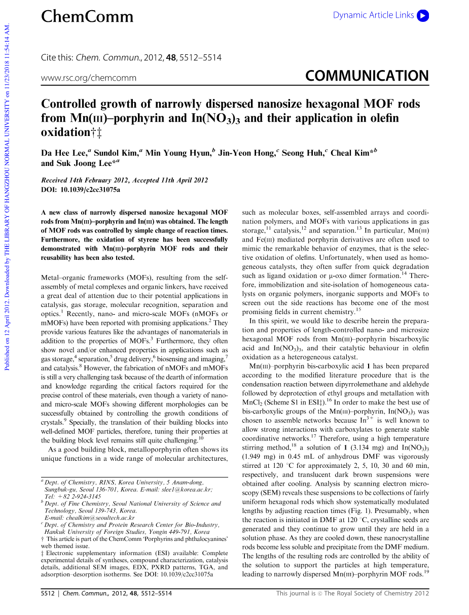 从Mn(III)-卟啉和In(NO3)3控制窄分散纳米尺寸六角形MOF棒的生长及其在烯烃氧化中的应用