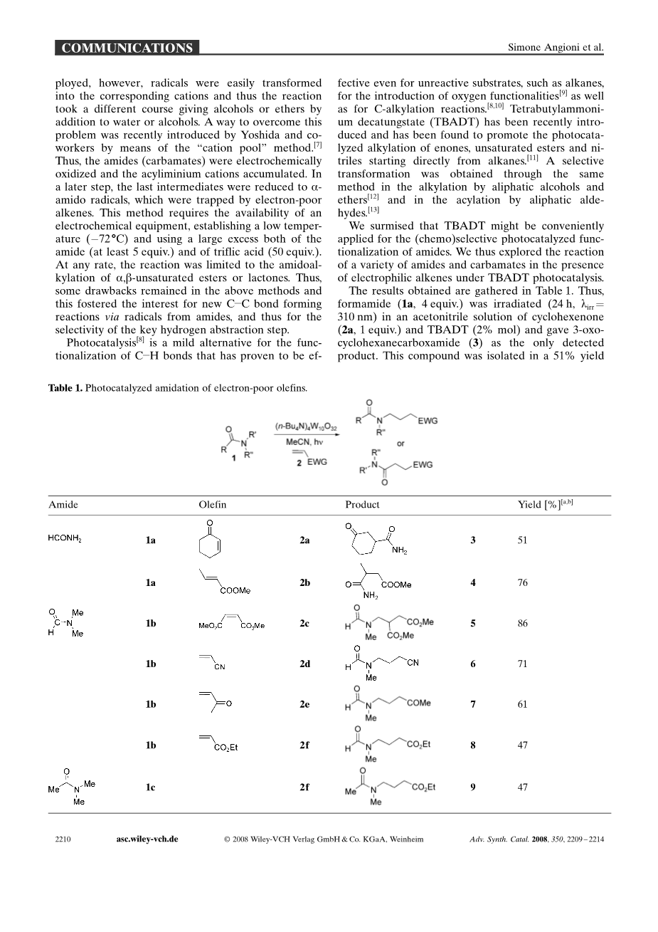 所得结果如下表1所示。因此,甲酰胺(1a,4当量)在环己烯酮(2a,1当量)和TBADT(2%mol)的乙腈溶液中辐照(24h,lambda;irr = 310nm),得到3-氧代环己烷甲酰胺(3)作为唯一可以被检测到的产物。通过两步程序,包括在真空下除去过量的1a,然后进行色谱分离,该化合物被分离出来的收率是51%。在没有TBADT存在的情况下,反应不会发生。使用较少量的酰胺会导致反应迟缓以及显著降低产品的收率。同样,1a与丁烯酸甲酯(2b) 在相同条件下反应可得到产率为76%的丁二酰胺酯衍生物4。