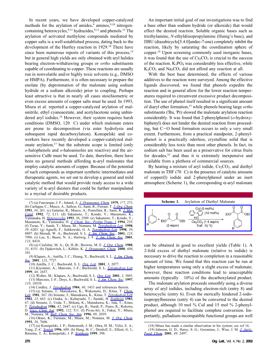 在惰性气氛(方案1)中,在催化量的碘化铜(I)和2-苯基苯酚存在下,通过在THF(70℃)中加热芳基碘,Cs2CO3和丙二酸二乙酯的混合物(方案1)丙二酸酯可以以良好至良好的收率得到(表1)。需要2倍过量的丙二酸二乙酯(相对于碘化物)以合理的方式使反应完成多少时间。我们发现该反应可以在较高的温度下运行,仅使用少量过量的丙二酸酯;然而,这些反应条件导致不可接受的量(通常为10%)的脱羧产物。