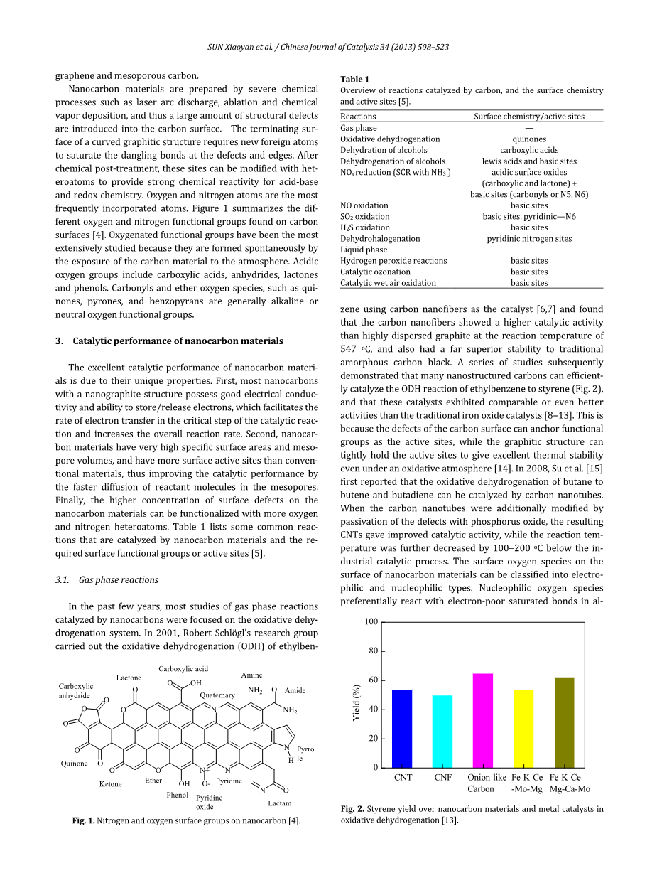 纳米碳材料的出色催化性能归因于其独特的性能。首先,大多数具有纳米石墨结构的纳米碳具有良好的电导率和存储/释放电子的能力,这促进了催化反应关键步骤中电子的转移速率并提高了总反应速率。其次,纳米碳材料具有非常高的比表面积和中孔体积,并且比常规材料具有更多的表面活性位点,从而通过反应物分子在中孔中的更快扩散而提高了催化性能。最后,纳米碳材料上较高浓度的表面缺陷可以用更多的氧和氮杂原子官能化。表1列出了一些由纳米碳材料催化的常见反应以及所需的表面官能团或活性位点[5]。