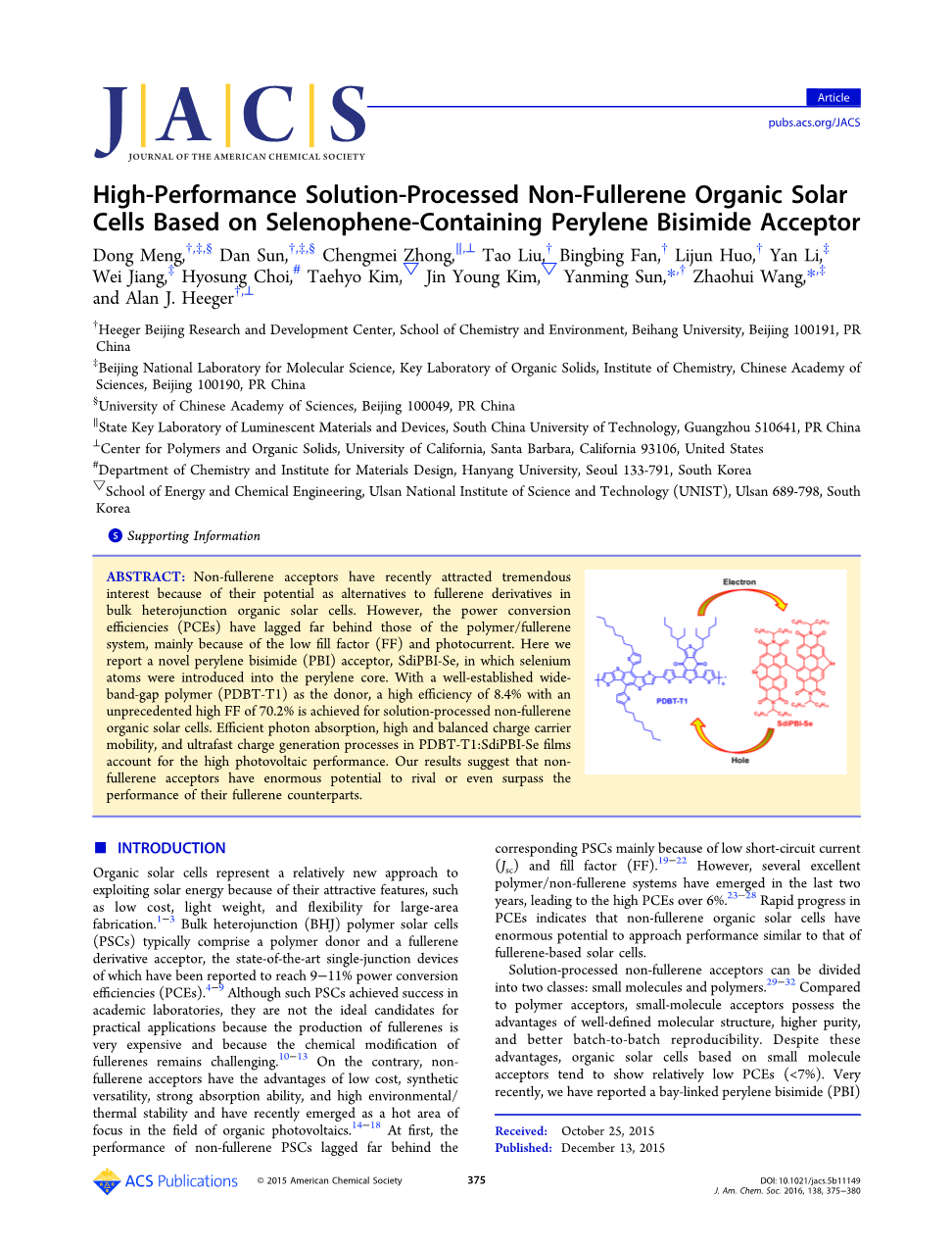 由于非富勒烯受体其在体异质结有机太阳能电池中作为富勒烯衍生物替代物的巨大潜力而最近引起了极大的兴趣。然而,其光电转换效率(PCEs)远远落后于聚合物/富勒烯体系,这主要是因为较低的填充因子(FF)和光电流。在这里,我们报道了一种新的苝二酰亚胺(PBI)受体材料,SdiPBI-Se,其中硒原子被引入苝体系的核心。使用一种成熟的宽带隙聚合物(PDBT-T1)作为给体,对可溶液加工的非富勒烯有机太阳能电池来说,使得8.4%的高效率和70.2%的高填充因子得以实现。在PDBT-T1:SdiPBI-Se薄膜中,高效的光子吸收、高且平衡的电荷载流子迁移率和超快的电荷生成过程是高光伏性能的原因。我们的研究结果表明,非富勒烯受体材料具有巨大的潜力,可以媲美甚至超过与其对应富勒烯的性能。