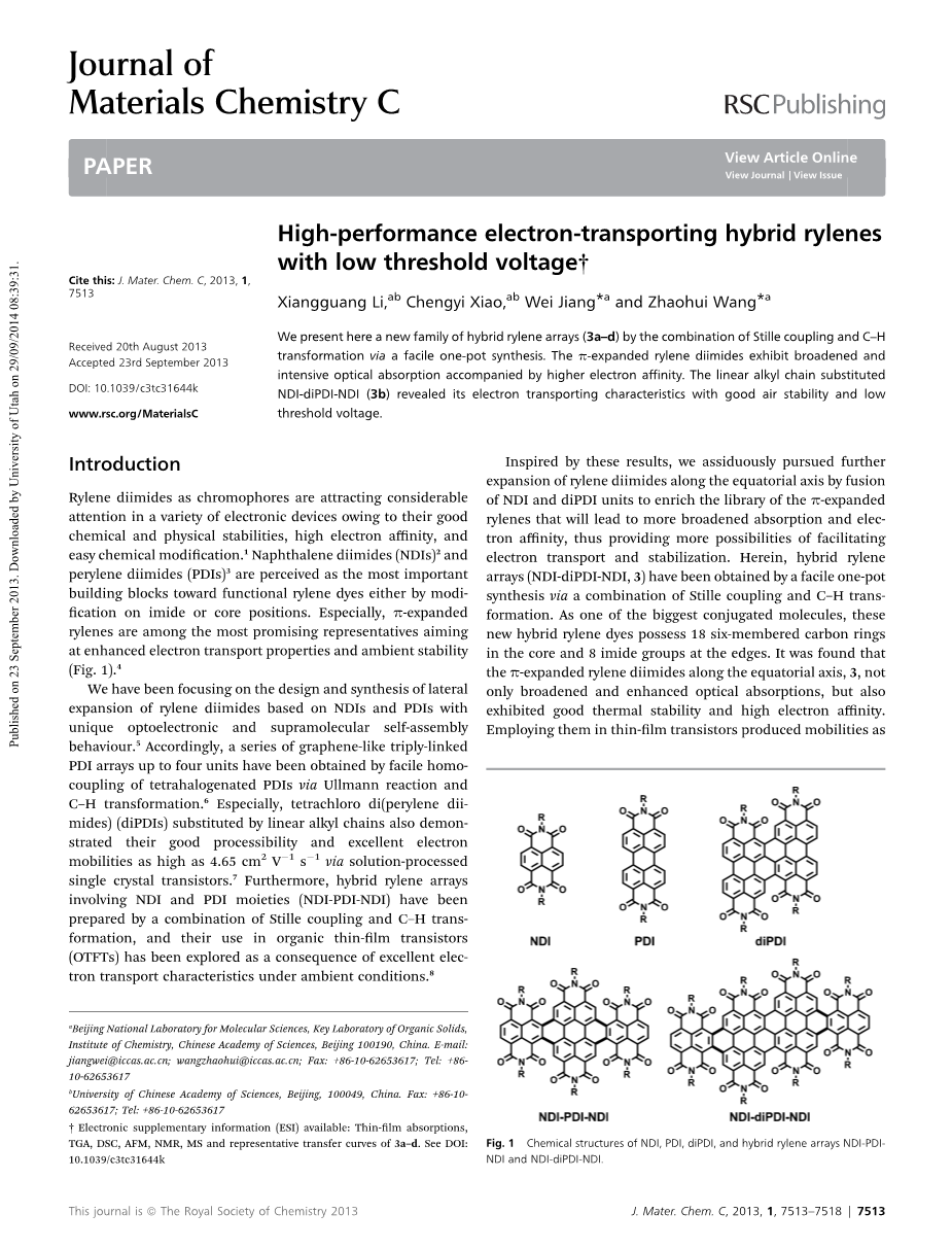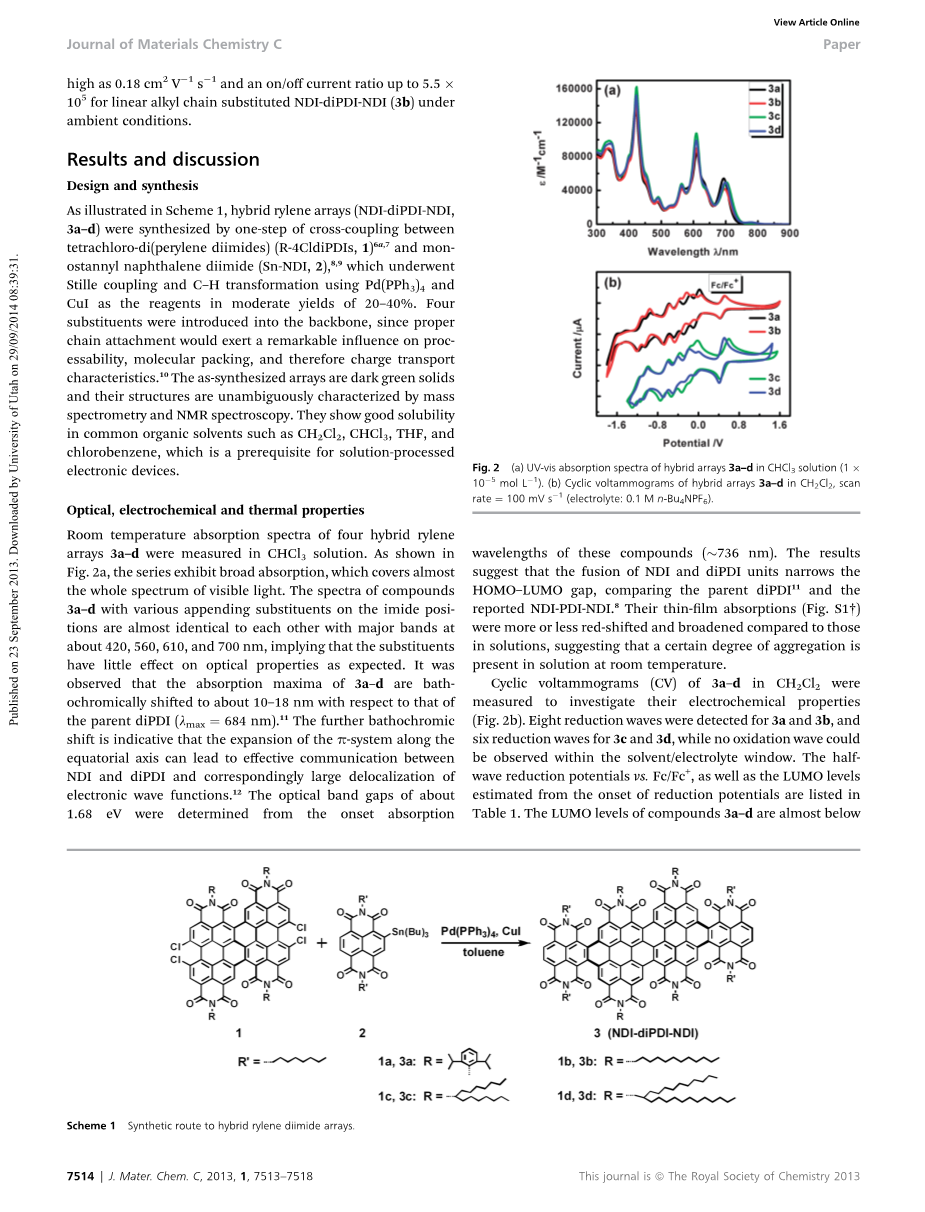 我们在这里提出通过简便的一锅法合成将Stille偶联和C-H转化相组合一个新的杂化酰亚胺阵列(3a-d),pi;-扩展杂化酰亚胺表现出更宽和更强烈的的光学吸收和优良的电子亲和力,直链烷基链被取代的NDI-diPDI-NDI(3b)具有良好的电子传输特性,空气稳定性和低阈值电压。