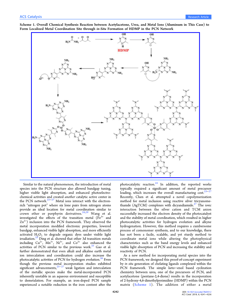 作为将金属物质掺入PCN骨架的新方法,我们通过在PCN框架内原位产生螯合配体复合物设计了这种概念验证实验。尿素(PCN的前体之一)与乙酰丙酮(戊烷-2,4-二酮)之间的简单酮基烯醇基环化化学导致在PCN基质中掺入2-羟基-4,6-二甲基嘧啶(HDMP)(方案1),添加金属乙酰丙酮络合物或乙酰丙酮(aa)与任何金属前体诱导类似的合成过程。这一观察结果表明羟基和氮孤对HDMP可作为双齿局部金属螯合剂,在去质子化时配制出新的金属配位点(同时具有O-和N-配体)。在各种金属中,我们选择铝作为研究新金属配位效应的模型金属,其他过渡金属、碱金属和碱土金属离子可能有其自身的催化性能或影响光催化活性的已知因素。据我们所知,铝离子没有任何报道的改变光催化性能的效果。因为我们想要排除不同金属离子的其他催化性能,铝只适用于研究新金属配位点的影响。我们测试了有机化合物降解和H2析出作为这种掺入Al的PCN光催化剂的模型反应。高活性的Al掺入PCN这一经济且容易的合成方法开辟了许多新的可能性,可以使用各种金属物质使碳氮化物的光化学活性更适合于实际应用。
