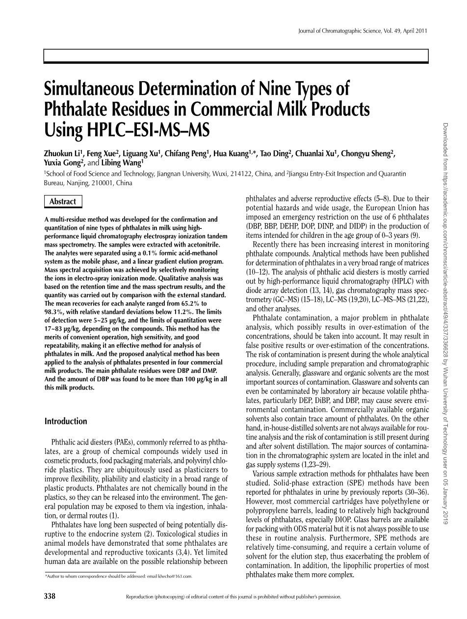 使用HPLC-ESI-MS-MS法同时测定商业奶制品中9种邻苯二甲酸酯的残留量