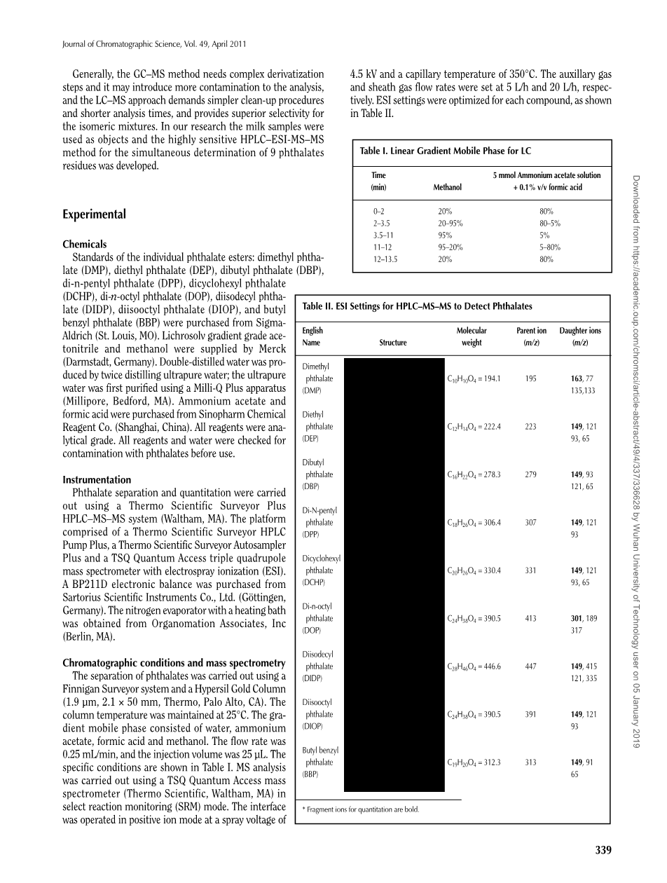 色谱条件和质谱分析:邻苯二甲酸酯的分离进行了使用菲尼根测量系统和海波西尔合金色谱柱(1.9micro;m, 2.1times;50mm,热,帕洛阿尔托,CA)。柱温维持在25℃。梯度流动相由水、醋酸铵、甲酸和甲醇组成。流量为0.25 mL/min,注入体积25micro;L。具体条件见表Ⅰ。MS分析采用TSQ量子访问质谱仪(热的系统, 沃尔瑟姆, MA)在选择反应监测 (SRM)模式下进行。该界面在4.5 kV喷雾电压和350℃毛细管温度下以正离子方式工作。辅助气体流量为5 L/h,鞘层气体流量为20 L/h。ESI设置为每个化合物进行了优化,如表II所示。