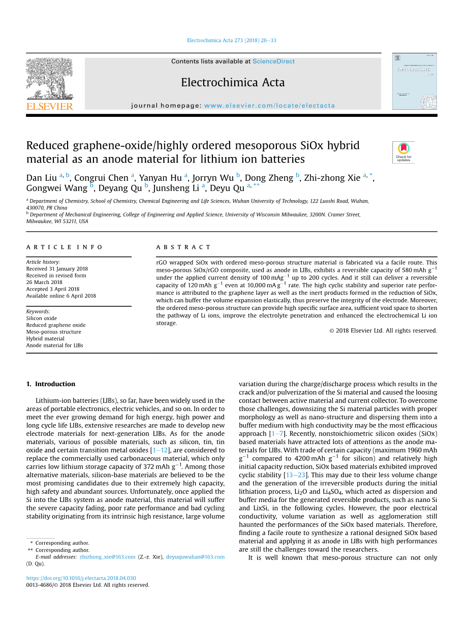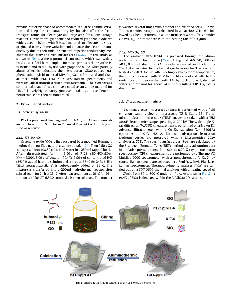 关键词:氧化硅,还原氧化石墨烯,介孔结构,杂化材料,锂离子电池阳极材料