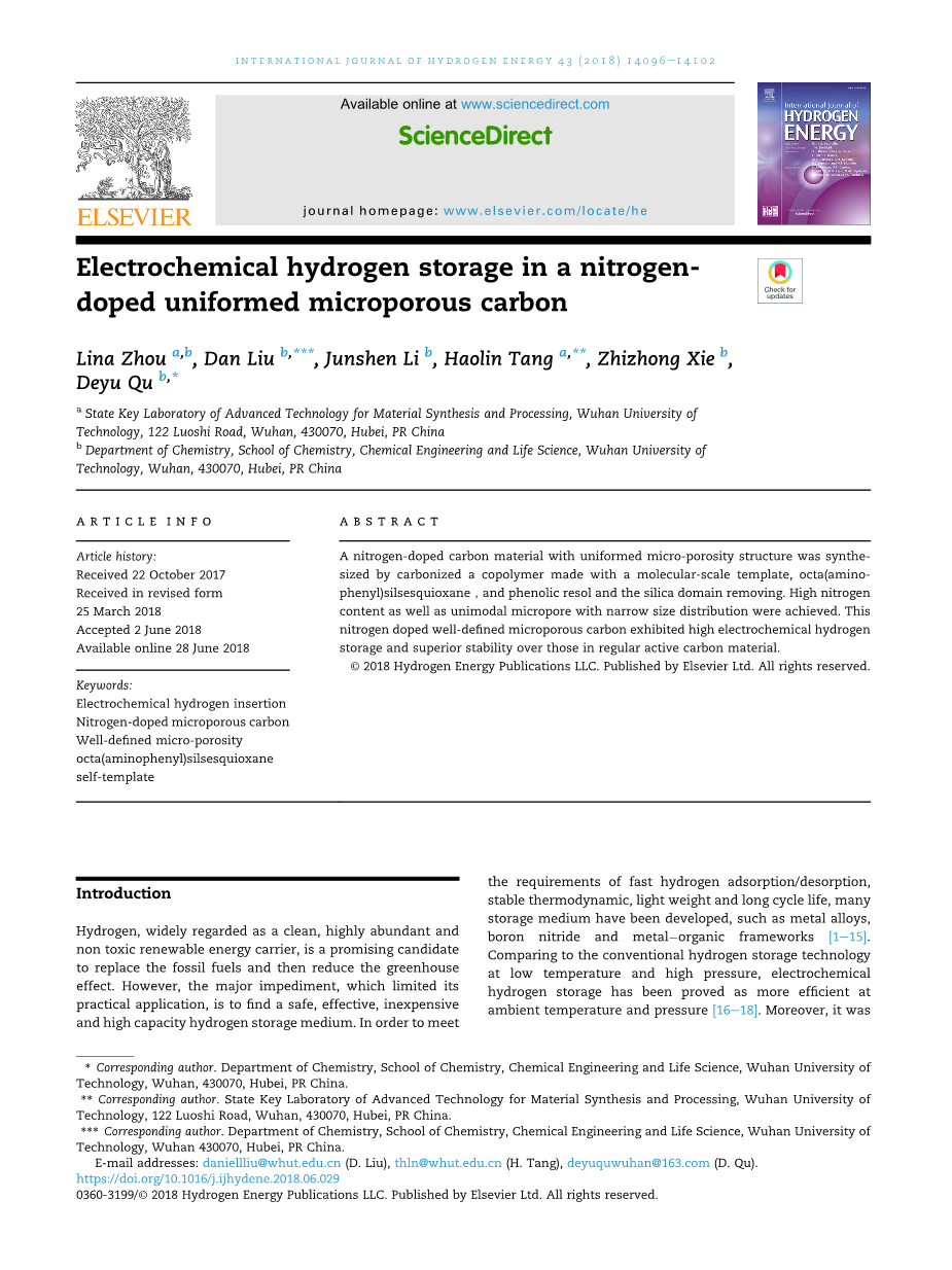 氮掺杂有序微孔碳的电化学储氢外文翻译资料