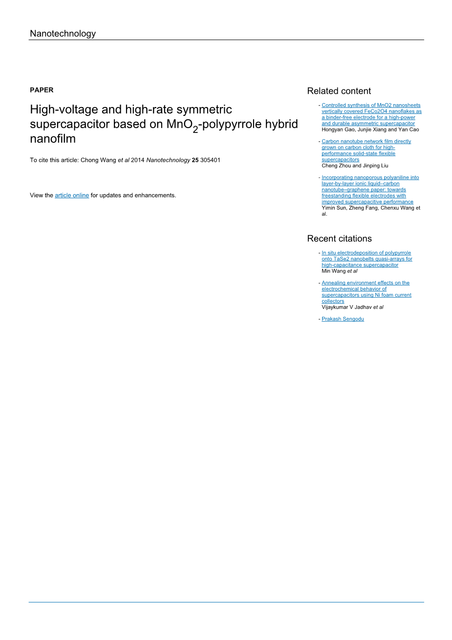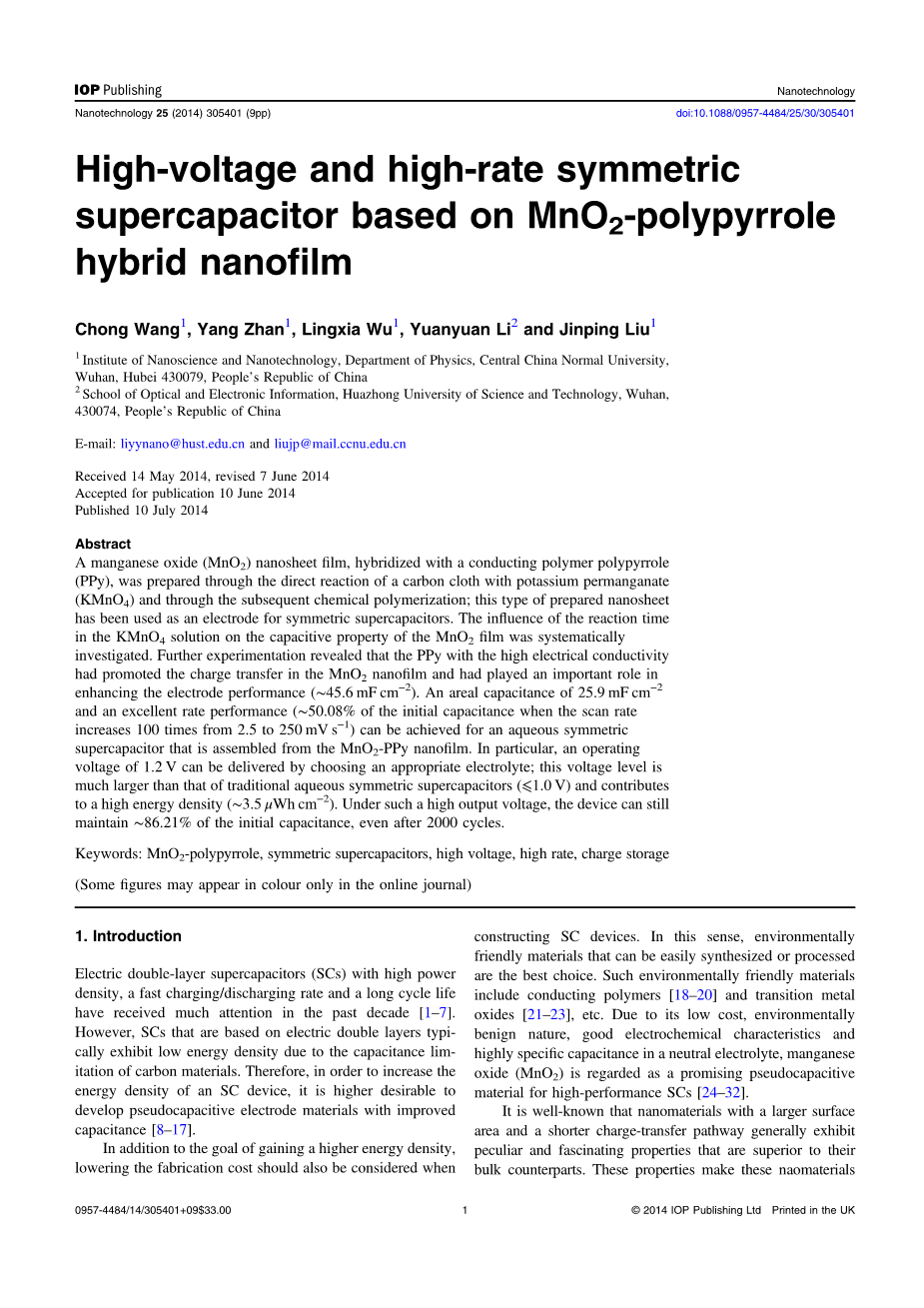 基于 MnO2-聚吡咯杂化 纳米薄膜的高容量、高倍率对称超级电容器外文翻译资料