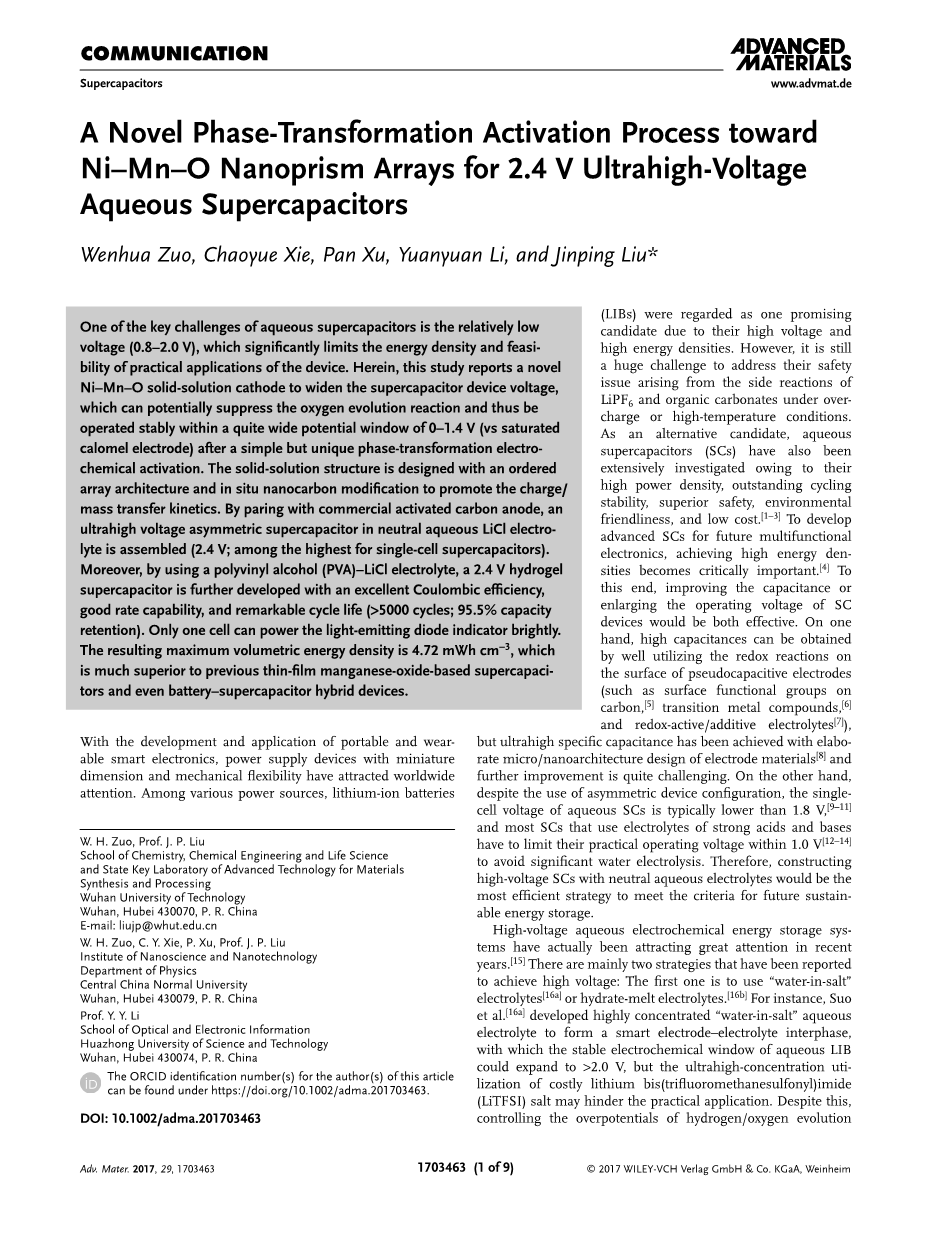受上述考虑的启发,本文提出了一种新型MnO基3d金属一氧化物固溶体阴极(Ni-Mn-O),并进一步开发了超高压水系SC。Ni-Mn-O固溶体直接在具有纳米棱镜阵列结构的集流体基底上合成。通过氧键[34,35]观察到Mn和Ni阳离子之间显著的协同作用,从而得到优化的Ni0.25Mn0.75O固溶体组分。通过非常简单但独特的相变电化学活化,原始Ni0.25Mn0.75O转化为低结晶LiNi0.5Mn1.5O4,这有趣地抑制了氧的释放,并在0-1.4V的超宽电化学窗口内有效工作,这是实现SC器件高电压的关键。还应用了简便的原位碳改性策略,以确保纳米颗粒中纳米碳分布均匀,这增加了电极的电导率,促进了电荷转移动力学,并显著提高了循环稳定性。因此,在1mAbull;cm-2的相同电流密度下,使用纳米碳(Ni0.25Mn0.75O@C),面积电容(Ca)可以增加六倍,从MnO的39.43mFbull;cm-2增加到包纳米碳的Ni0.25Mn0.75O的242.86mFbull;cm-2 (Ni0.25Mn0.75O@C)。循环性能也从500倍大幅提高到5000倍。此外,通过集成活性炭(AC)阳极和聚乙烯醇(PVA)-LiCl水凝胶电解质,开发了一种薄的(约170micro;m)准固态不对称SC,该SC可以达到2.4V的超高电压,同时保持优异的库仑效率(约99.4%)、良好的倍率性能和长寿命。我们设备的最大体积能量和功率密度分别为4.72mWhbull;cm-3和776mWbull;cm-3,远远优于所有报道的基于准固态二氧化锰的不对称SCs,甚至是典型的电池-SC混合设备。