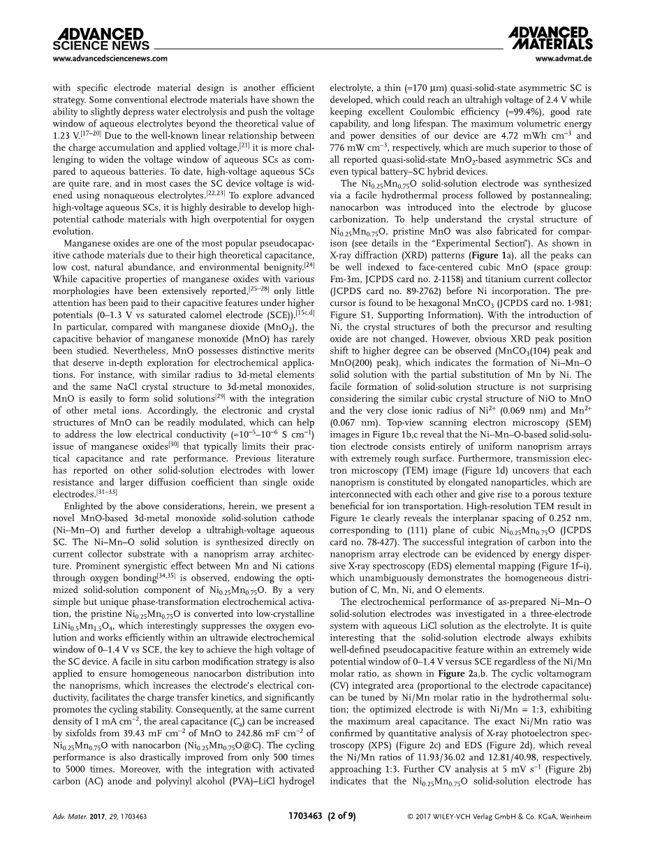 锰氧化物是最受欢迎的准电容阴极材料之一,因为它具有高理论电容、低成本、自然丰度和环境友好性[24]。虽然各种形态锰氧化物的电容特性已被广泛报道[25–28],但在较高电位(0-1.3V相对于饱和甘汞电极(SCE))下,对其电容特性关注甚少。[15c,d]特别是与二氧化锰(MnO2)相比,很少研究一氧化锰(MnO)的电容行为。然而,MnO具有独特的优点,值得对其电化学应用进行深入探索。例如,与3d金属元素半径相似,与3d金属单氧化物具有相同的NaCl晶体结构,MnO很容易与其他金属离子结合形成固溶体[29]。因此,MnO的电子和晶体结构可以容易地被调节,这有助于解决锰氧化物[30]的低电导率(10-5–10-6Scm-1)问题,该问题通常限制了它们的实际电容和速率性能。以前的文献已经报道了其他比单一氧化物电极电阻更低、扩散系数更大的固溶体电极[31-33]。