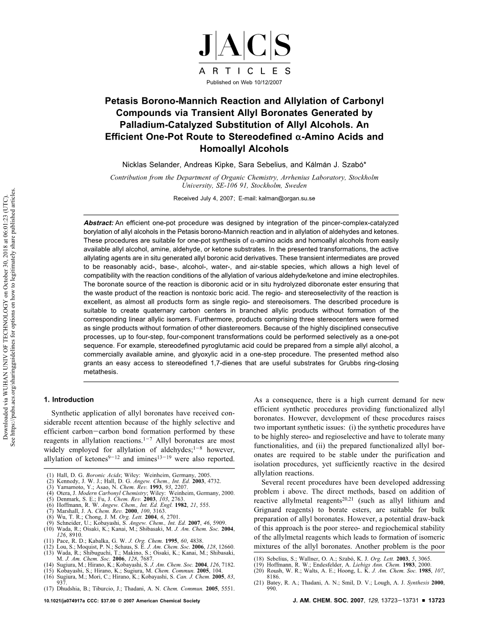 钯催化烯丙醇取代生成的烯丙基硼酸酯中间体的Petasis Borono-Mannich反应和羰基化合物烯丙基化反应。一种有效的可用于立体定义alpha;-氨基酸和高烯丙基醇的一锅法路线。