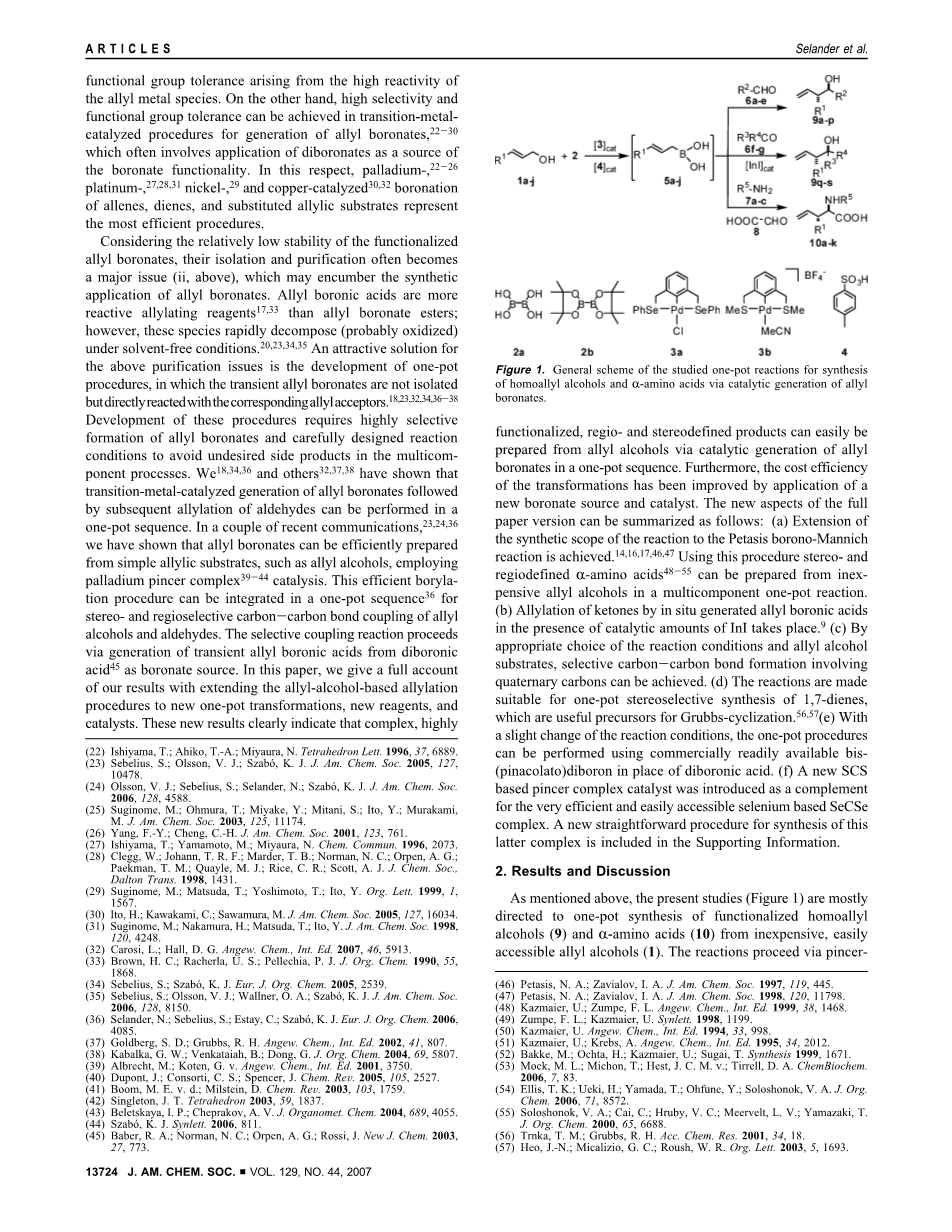 考虑到官能化烯丙基硼酸酯的相对低的稳定性,它们的分离和纯化经常成为主要问题(如上所述),这可能妨碍烯丙基硼酸酯的合成应用。烯丙基硼酸是比烯丙基硼酸酯更具反应性的烯丙基化试剂17,33;然而,这些物种在无溶剂条件下迅速分解(可能被氧化)20,23,34,35。用于上述纯化问题的有吸引力的解决方案是开发一锅法,其中瞬时烯丙基硼酸酯不是分离的,而是直接与相应的烯丙基受体反应18,23,32,34,36-38。这些方法的开发需要高度选择性地形成烯丙基硼酸酯和精心设计的反应条件,以避免多组分过程中不需要的副产物。我们18,34,36和其他人32,37,38已经表明过渡金属催化的烯丙基硼酸酯的生成,随后醛的烯丙基化可以在一锅法序列中进行。在最近的几个通讯中23,24,36,有我们已经证明,烯丙基硼酸酯可以用简单的烯丙基底物如烯丙醇有效地制备,使用钯钳复合物39-44催化。这种有效的硼酸化方法可以整合在一锅序列36用于烯丙醇和醛的立体和区域选择性碳—碳键偶联。选择性偶联反应通过从二硼酸45产生瞬时烯丙基硼酸而进行作为硼酸盐源。在本文中,我们将基于烯丙醇的烯丙基化程序扩展到新的一锅转化,新试剂和催化剂,充分考虑了我们的结果。这些新结果清楚地表明,通过以一锅法顺序催化生成烯丙基硼酸酯,可以从烯丙醇容易地制备复杂的,高度官能化的区域和立体定义产物。此外,通过应用新的硼酸盐源和催化剂,改善了转化的成本效率。全文版本的新方面可概括如下:(a)实现将反应的合成范围扩展到Petasis Borono-Mannich反应14,16,17,46,47。使用此过程立体和区域定义 alpha;氨基酸48-55可以从便宜的烯丙基醇中的多组分一锅反应来制备。(b)在催化量的碘化铟存在下,通过原位产生的烯丙基硼酸对酮进行烯丙基化9。(c)通过适当选择反应条件和烯丙醇底物,可以实现涉及季碳的选择性碳—碳键形成。(d)使反应适合于1,7-二烯的一锅式立体选择性合成,其是Grubbs环化的有用前体56,57。(e)随着反应条件的轻微变化,可以使用市售的双(频哪醇合)二硼代替二硼酸进行一锅法。(f)引入了一种新的基于SCS的钳形复合催化剂作为非常有效且易于获得的基于硒的SeCSe复合物的补充。合成后一种复合物的新简单程序包含在支持信息中。