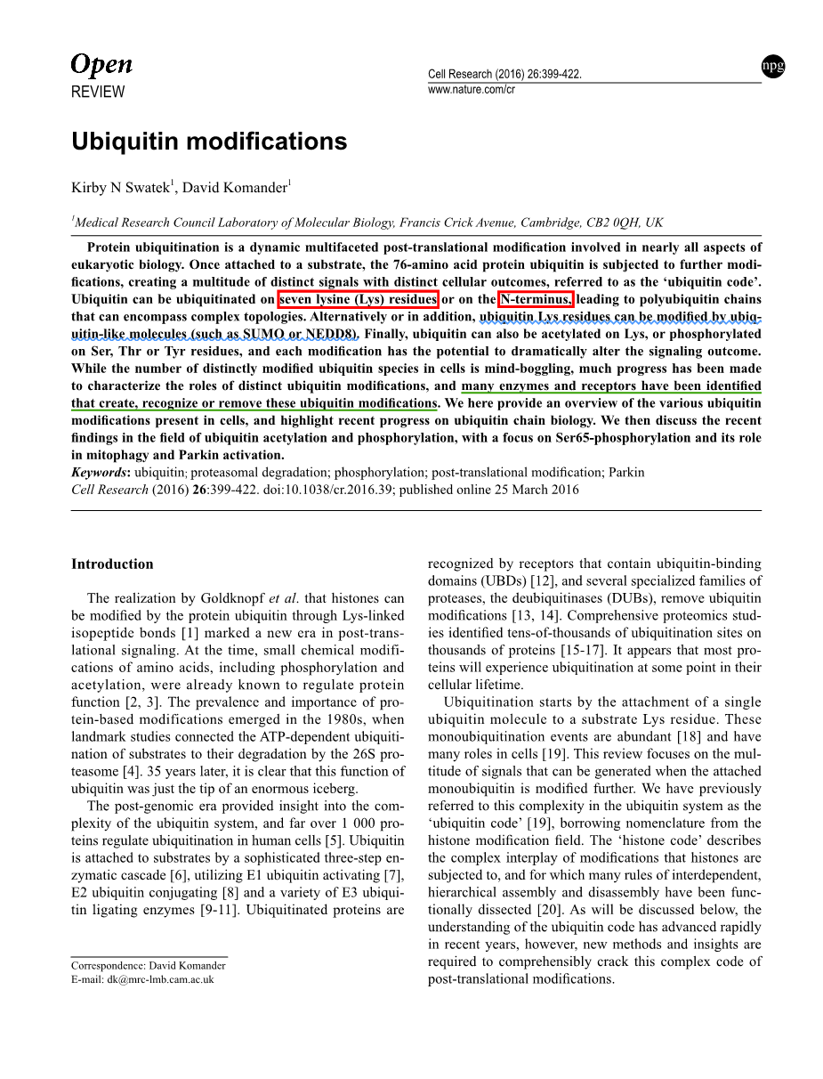 Goldknopf等人实现的组蛋白被蛋白泛素通过赖氨酸连接的异肽键[1]修饰,标志着翻译后信号的新时代。当时,已知氨基酸的小化学修饰(包括磷酸化和乙酰化)调节蛋白质功能[2,3]。基于蛋白质修饰的流行和重要性出现在20世纪80年代,当时标志性研究将ATP依赖性底物泛素化与底物26S蛋白酶体的降解联系起来[4]。35年后,很明显泛素的这种功能只是一个巨大冰山的一角。