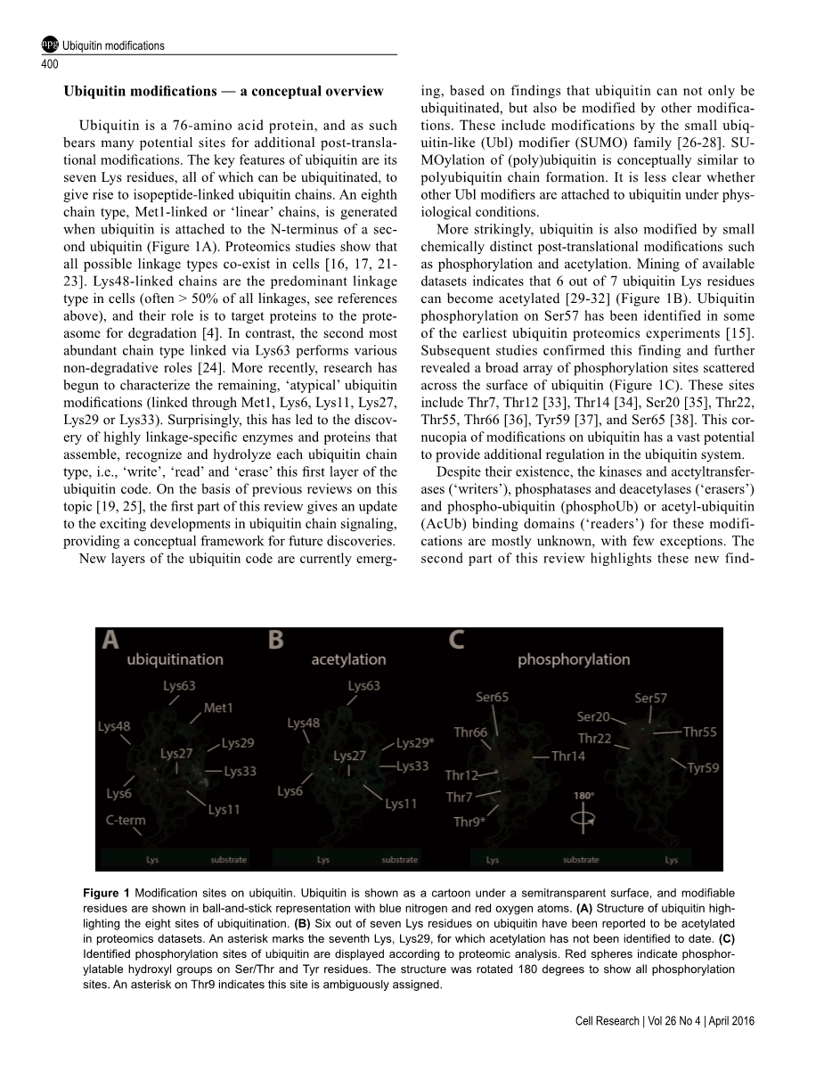 尽管存在这些修饰的激酶和乙酰转移酶(lsquo;writersrsquo;),磷酸酶和脱乙酰基酶(lsquo;erasersrsquo;)和磷酸泛素(phosphoUb)或乙酰泛素(AcUb)结合结构域(lsquo;readersrsquo;),除少数例外,它们的修饰仍然大部分是未知的。这篇综述的第二部分重点介绍了这些新的发现