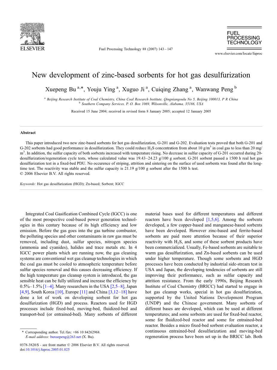 整体煤气化联合循环(IGCC)由于具有高效率和低排放的特点,是本世纪最具潜力的煤基发电技术之一。在气体进入燃气轮机燃烧室之前,必须去除原料气中的污染物质和其他污染物,包括灰尘,硫物质,氮物质(氨和氰化物),卤化物和痕量金属等。在目前正在运行的4个IGCC发电厂中,气体净化系统运用的是传统的在脱硫前必须将煤气冷却到大气温度的湿气净化技术,这会降低效率。如果引入高温气体净化系统,可充分利用气体显热,提高0.5%-1.5%的效率[1-4]。美国[2,5-8],日本[4,9],韩国[10],欧洲[11]和中国[3,12-18]的许多研究人员在开发热气脱硫(HGD)和工艺吸附剂方面做了大量工作。用于热气脱硫工艺的反应器包括固定床,移动床,流化床和运输床(或夹带床)。许多用于不同温度和不同反应器的不同物质碱的吸附剂已经被开发出来[1,5,6]。在开发的吸附剂中,已经开发了一些酮基和锰基吸附剂。然而,锌基和铁氧体基吸附剂由于其与硫化氢的优异反应性而受到更多关注,并且这些吸附剂产品中的一些已经商业化。铁基吸附剂一般适用于温气脱硫,而锌基吸附剂可在较高温度下使用。虽然在美国和日本通过工业侧流试验已经进行了一些吸附剂和热气脱硫工艺,但吸附剂的发展趋势仍然在改善其性能,如硫容量和耐磨性。从20世纪90年代开始,北京煤化学研究所(BRICC)在联合国开发计划署(UNDP)和中国政府的支持下开始从事热气体净化工程,特别是热气脱硫工程。开发了许多可在不同温度下使用的不同碱的吸附剂,一些吸附剂用于固定床反应器,一些用于流化床反应器,一些用于夹带床反应器。除了微型固定床吸附剂评估反应器外,BRICC实验室还建立了连续夹带床脱硫和移动床再生工艺。试验可采用真实的流化床气化气体和模拟气体;并在热气脱硫系统上进行了一些进口吸附剂和BRICC吸附剂之间的可比性测试。下面介绍了在侧流固定床热气脱硫工艺中使用的两种新开发的锌基吸附剂的测试结果。测试目的是检查吸附剂在长时间操作下的反应稳定性。