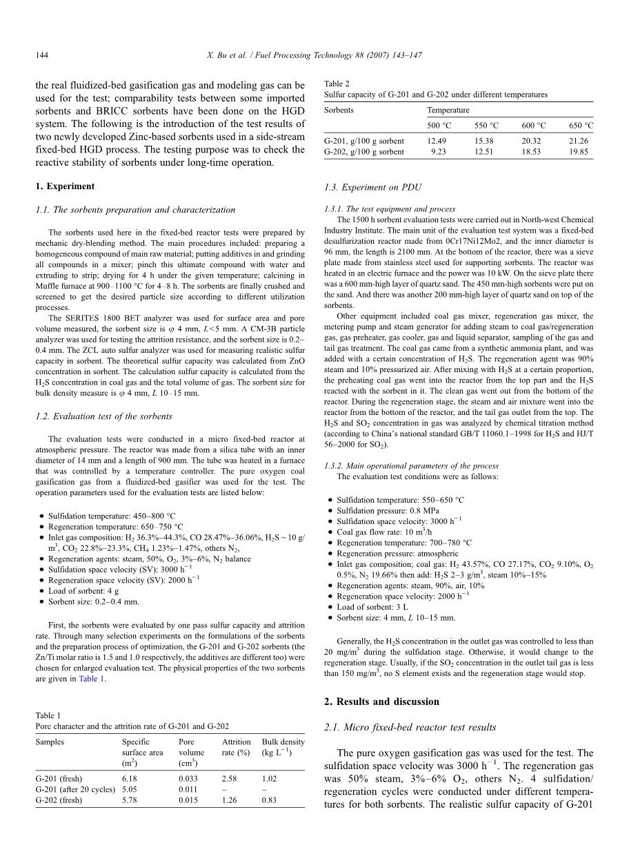 测试采用纯氧气化气。硫化空间速度为3000h-1。再生气体为50%蒸汽,3%-6%氧气,其他的是氮气。两种吸附剂在不同温度下进行了4次硫化/再生循环。表2给出了最后一个硫化阶段的G-201和G-202吸附剂在500℃-650℃温度下的实际硫容量。