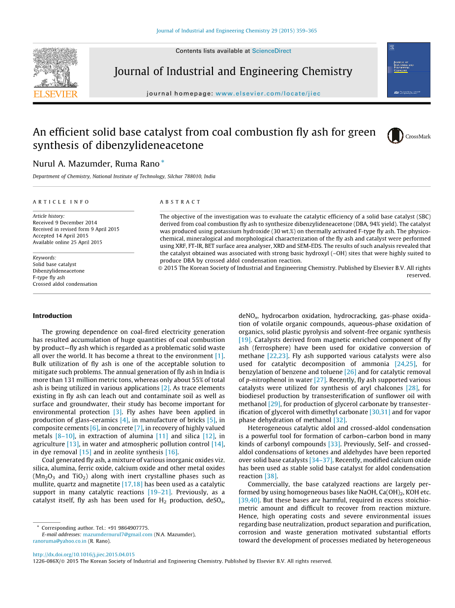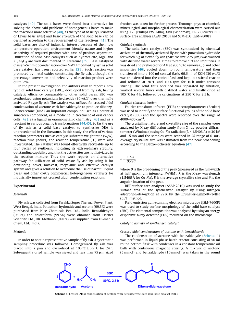 一种用于绿色合成二亚苄基丙酮的高效的煤燃烧飞灰固体碱催化剂外文翻译资料