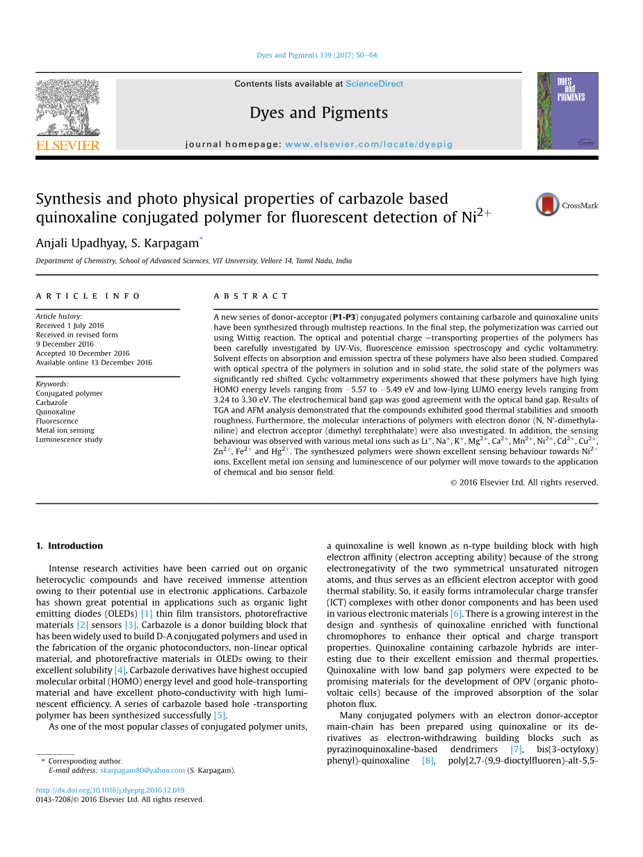 人们已经设计并合成了含有咔唑和喹喔啉单元的新型pi;共轭聚合物。在聚合物(P1-P3)中,咔唑在氮原子上具有不同的烷基链充当空穴转移单元,并且2,3-二甲基喹喔啉充当电子转移和发光作用。已经研究了聚合物的吸收和发射光谱,电化学性质。通过荧光技术研究了聚合物与二甲基苯胺(DMA)和对苯二甲酸二甲酯(DMTP)的相互作用。喹喔啉和咔唑的组合有望扩大光物理和光化学性质的多样性。一系列D-A共轭聚合物,P1-P3,其中氮原子上有不同的烷基链。化学传感器在 存在下显示出优异的荧光强度增强,而对其他碱金属,碱土金属和过渡金属没有显着影响。这里介绍的工作是我们设计化学传感器的一部分,它能够表示金属阳离子的识别。