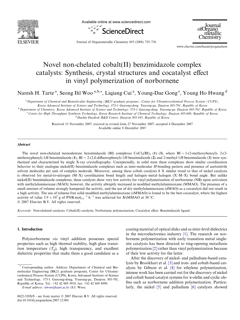 关键词:非螯合催化剂;钴(II)催化剂;降冰片烯聚合;助催化剂效果;苯并咪唑配体