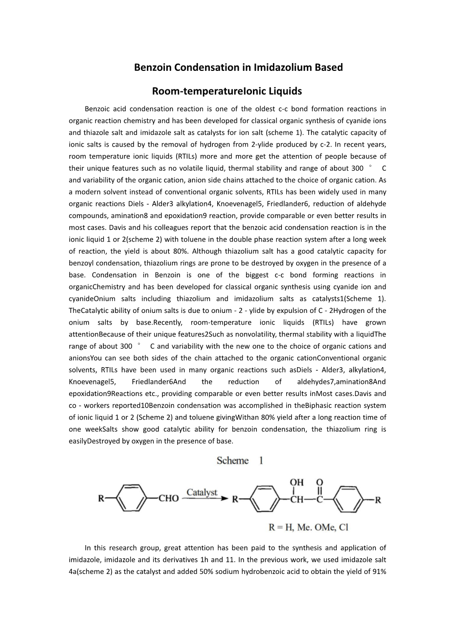 苯甲醛缩合反应是有机反应中最古老的C-C键形成反应之一化学和已开发的经典有机合成用氰化物离子和以噻唑盐和咪唑盐为催化剂的离子盐(方案1)。离子盐的催化能力是由C-2排出生成的2-ylide所致氢离子盐的氢。近年来,室温离子液体(RTILs)越来越受到人们的关注因为他们独特的特点如不挥发性、热稳定性与液体范围约300°C和可变性的有机阳离子,阴离子的选择侧链连着有机阳离子。作为近代溶剂而不是传统的有机溶剂,RTILs在许多有机反应中得到了广泛的应用Diels-Alder3,alkylation4,Knoevenagel5,Friedlander6,醛类化合物的还原,amination8和epoxidation9反应等,提供可比的甚至更好的结果大多数情况下。戴维斯和他的同事报告说苯甲醛缩合反应是在离子液体1或2(方案2)与甲苯的双相反应体系经过一个星期的长时间反应,收率约为80%。尽管thiazolium盐对苯甲酰的缩合具有良好的催化能力,噻唑烷环易于缩合在碱的存在下被氧破坏。