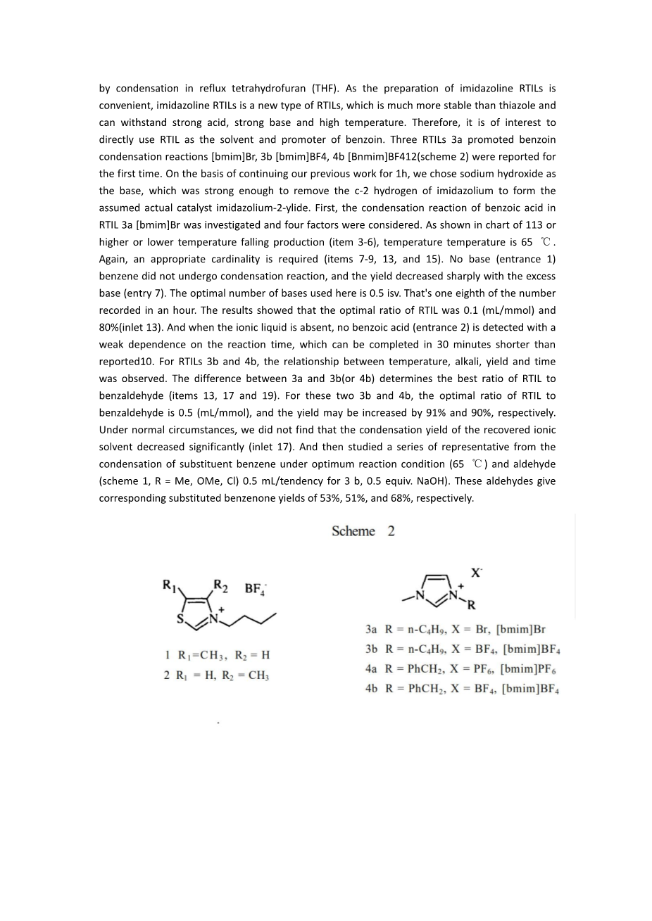 在本课题组中,对该化合物的合成和应用给予了极大的关注咪唑、咪唑及其衍生物1h、11。在之前的工作中1h,我们使用以咪唑盐4a(方案2)为催化剂,加入50%的氢氧化钠苯甲醛在回流四氢呋喃(THF)中缩合得到91%的收率用咪唑类似物as缩合苯甲醛的最佳收率催化剂。由于咪唑啉类RTILs的制备方便,因此咪唑啉类RTILs是一种新型的RTILs它比噻唑安定得多,能承受强酸、强碱和高温对直接用RTIL作为苯偶姻的溶剂和促进剂产生了兴趣凝结。本文报道了三种RTILs 3a促进苯偶姻缩合反应[bmim]Br, 3b [bmim]BF4, 4b [Bnmim]BF412(方案2)第一次。基于继续我们之前的工作1h我们选择氢氧化钠作为碱它足够强除去咪唑铵的C-2氢,形成假定的实际催化剂imidazolium-2-ylide。首先,苯甲醛在RTIL 3a [bmim]Br中的缩合反应为调查并考虑了四个因素。如表113所示或高或低温度导致产量下降(条目3-6),65℃为适宜温度温度。同样,需要适当的基数(条目7-9、13和15)。没有碱(入口1)苯并没有发生缩合反应,收率降低与过量的基础(条目7)急剧。这里使用的最佳基础数量是0.5等v。这只是1小时内记录在案的数字的八分之一。结果表明,RTIL的最佳配比对苯甲醛(mL / mmol)的收率为0.1 (mL / mmol),产率为80%(入口13)。和当离子液体缺失时,没有检测到苯甲醛(入口2)对反应时间的依赖性较弱,可以在30分钟内完成比reported10短。对于RTILs 3b和4b,温度、碱、观察了产率与时间的关系。3a与3b(或4b)的差值确定了RTIL与苯甲醛的最佳配比(条目13、17和19)。对于这两个3b和4b, RTIL与苯甲醛的最佳配比为0.5 (mL / mmol),收率较高可能分别上升91%和90%。常规情况下,我们回收离子溶剂并没有发现缩合产率明显下降(入口17)。然后研究了一系列具有代表性取代基的自缩合最佳反应条件(65℃)下苯并醛(方案1,R= Me, OMe, Cl)0.5 mL/mmol 3b, 0.5 equiv. NaOH)。这些醛给出了相应的取代苯并酮的产率分别为53%、51%和68%。